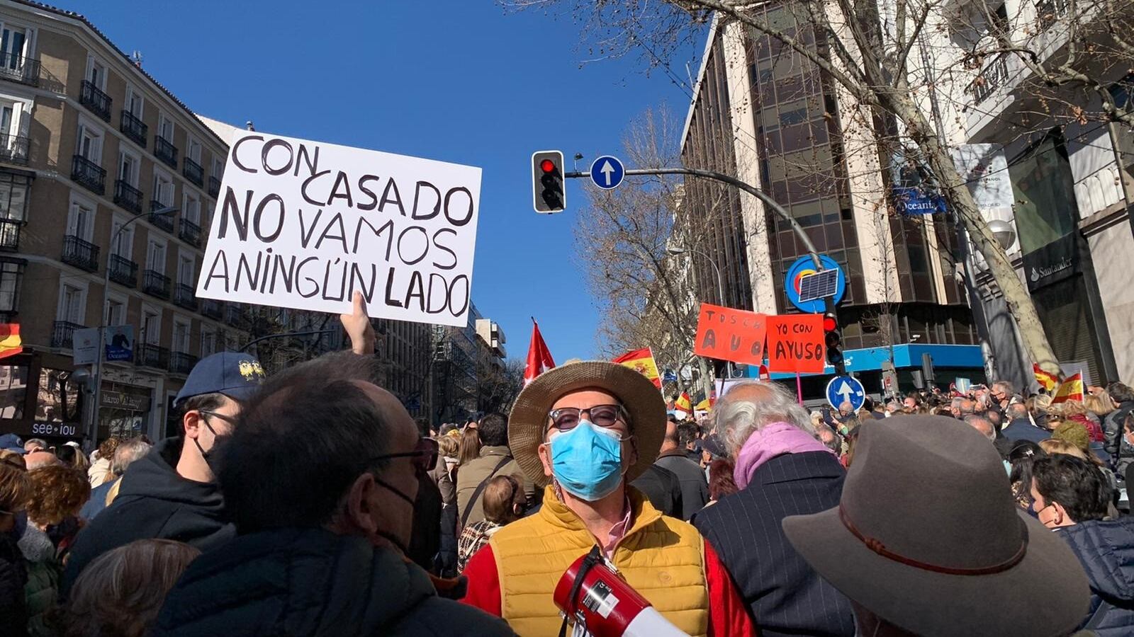 «¡Todos con Ayuso!», han coreado los asistentes al comienzo de la concentración a favor de la presidenta de la Comunidad de Madrid, en medio de la guerra interna del Partido Popular.