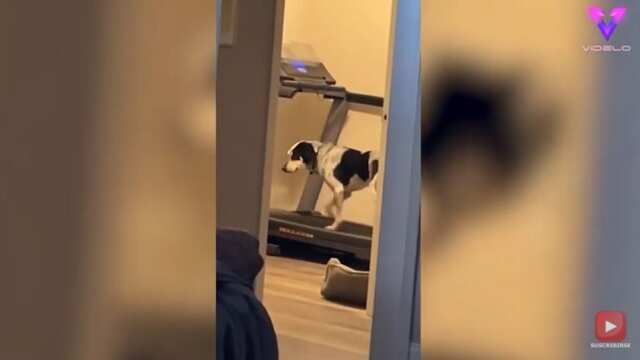El mal tiempo hizo que Bowie, de ocho años, no pudiera salir a pasear como de costumbre, pero en su lugar se le puede ver caminando con paso firme en la cinta de correr.