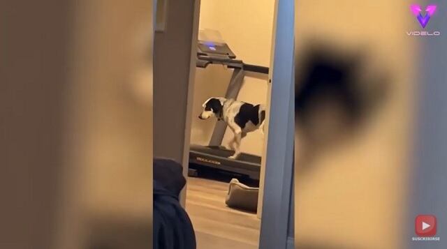 El mal tiempo hizo que Bowie, de ocho años, no pudiera salir a pasear como de costumbre, pero en su lugar se le puede ver caminando con paso firme en la cinta de correr.