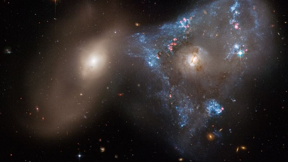 Los astrónomos sugieren que las galaxias se cruzaron entre sí, lo que encendió la tormenta de fuego de formación estelar de forma única en NGC 2445, donde miles de estrellas cobran vida en el lado derecho de la imagen. Esta galaxia está inundada de nacimiento de estrellas porque es rica en gas, el combustible que produce las estrellas. Sin embargo, aún no ha escapado de las garras gravitatorias de su compañera NGC 2444, que se muestra en el lado izquierdo de la imagen. La pareja está librando un tira y afloja cósmico, que NGC 2444 parece estar ganando. La galaxia ha extraído gas de NGC 2445, formando el extraño triángulo de estrellas recién acuñadas.