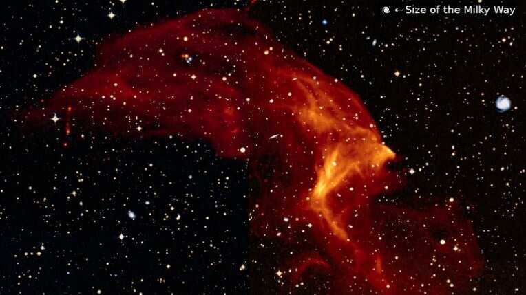 El tamaño de la onda de choque principal es impresionante, ya que abarca todo el ancho del cúmulo de galaxias con un tamaño total de 6,5 millones de años luz. A modo de comparación, la Vía Láctea, la galaxia en la que vivimos, es más de 60 veces más pequeña que esta onda de choque.