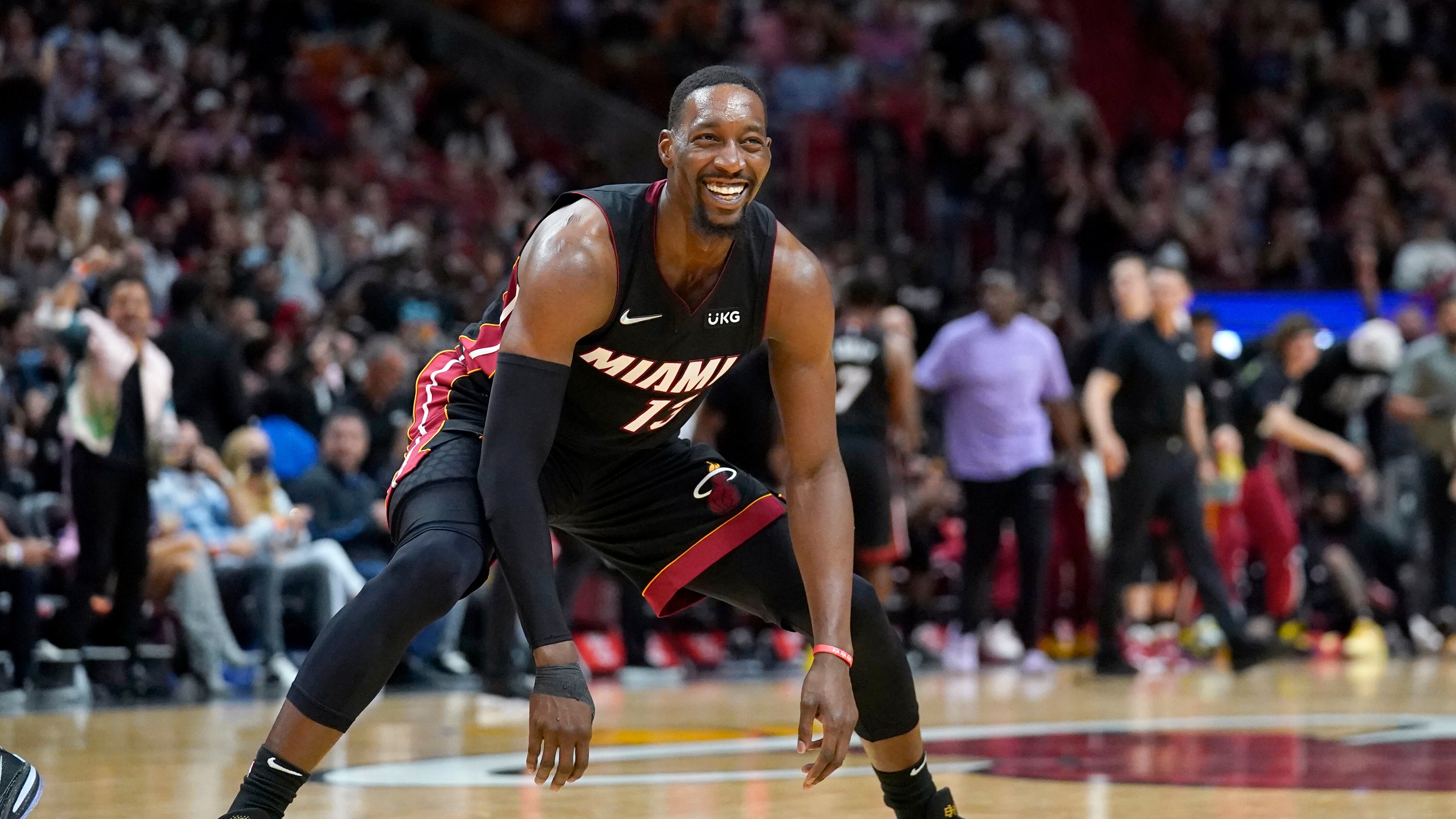 Bam Adebayo, pívot del Heat de Miami, festeja tras anotar un triple frente a los Spurs de San Antonio, en el compromiso del sábado 26 de febrero de 2022 (AP Foto/Lynne Sladky) Bam Adebayo, pívot del Heat de Miami, festeja tras anotar un triple frente a los Spurs de San Antonio, en el compromiso del sábado 26 de febrero de 2022 (AP Foto/Lynne Sladky) (Lynne Sladky/AP)