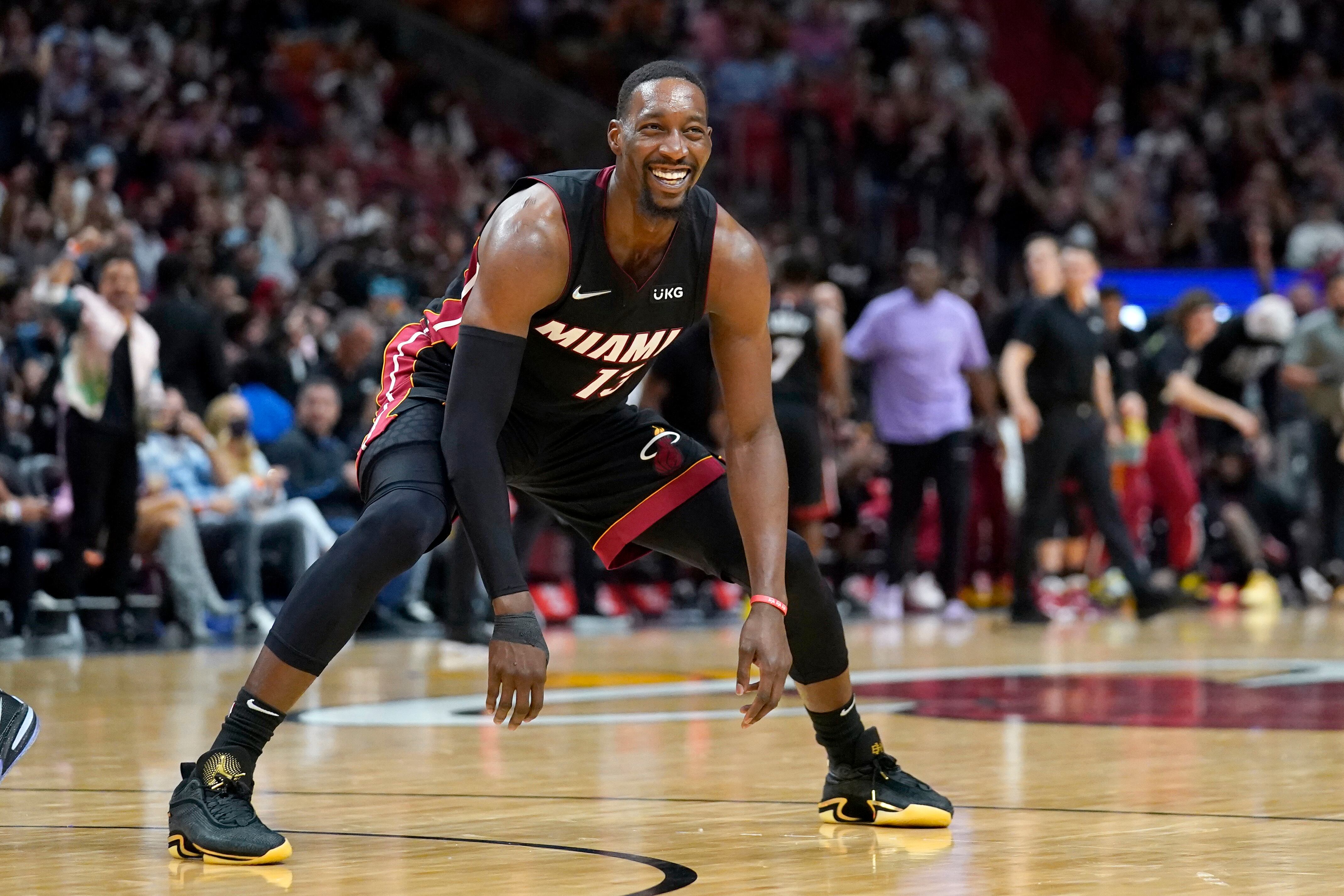Bam Adebayo, pívot del Heat de Miami, festeja tras anotar un triple frente a los Spurs de San Antonio, en el compromiso del sábado 26 de febrero de 2022 (AP Foto/Lynne Sladky) Bam Adebayo, pívot del Heat de Miami, festeja tras anotar un triple frente a los Spurs de San Antonio, en el compromiso del sábado 26 de febrero de 2022 (AP Foto/Lynne Sladky) (Lynne Sladky/AP)