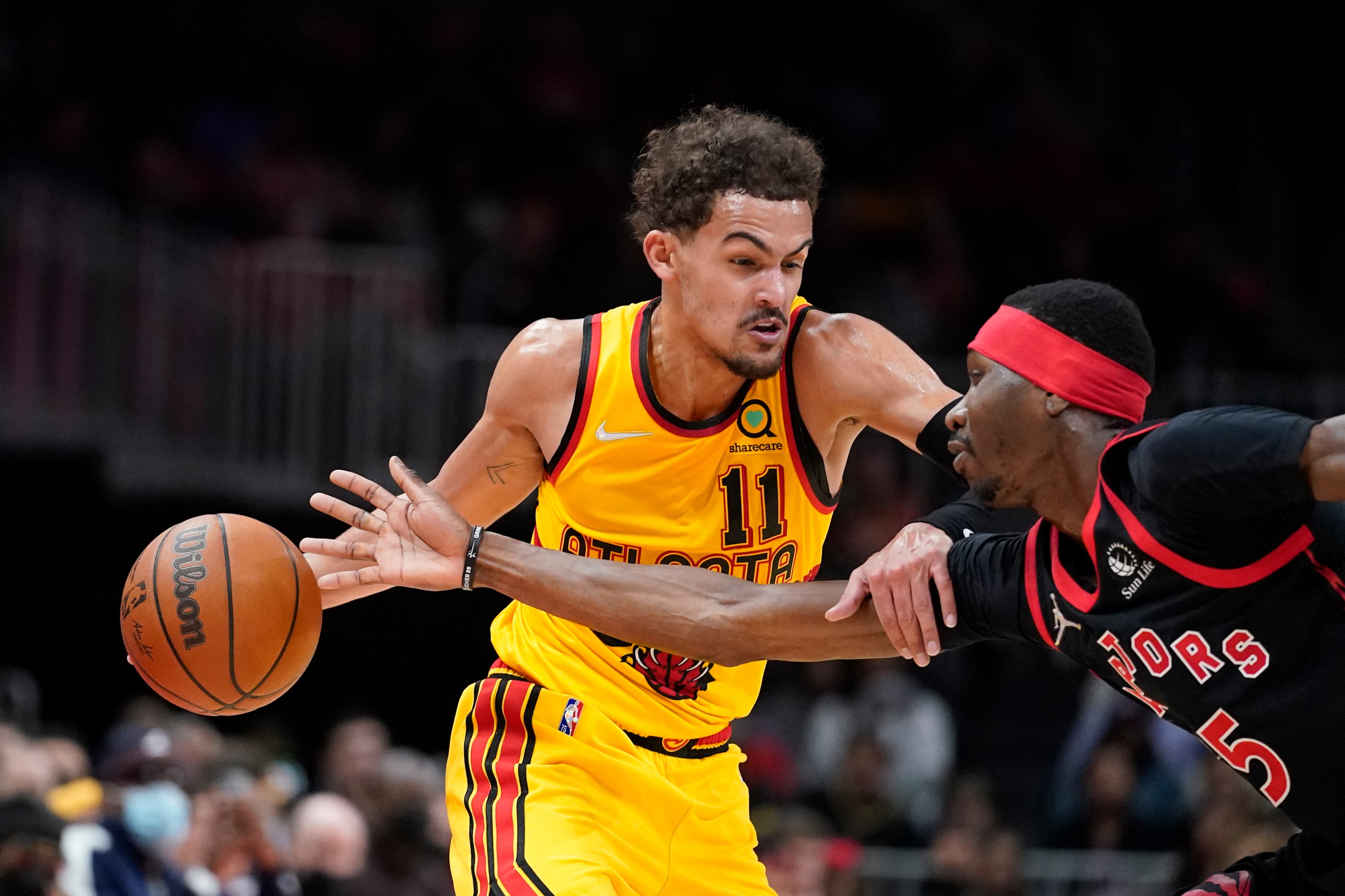 Trae Young, base de los Hawks de Atlanta, trata de eludir a Chris Boucher, de los Raptors de Toronto, en el partido del sábado 26 de febrero de 2022 (AP Foto/John Bazemore) Trae Young, base de los Hawks de Atlanta, trata de eludir a Chris Boucher, de los Raptors de Toronto, en el partido del sábado 26 de febrero de 2022 (AP Foto/John Bazemore) (John Bazemore/AP)