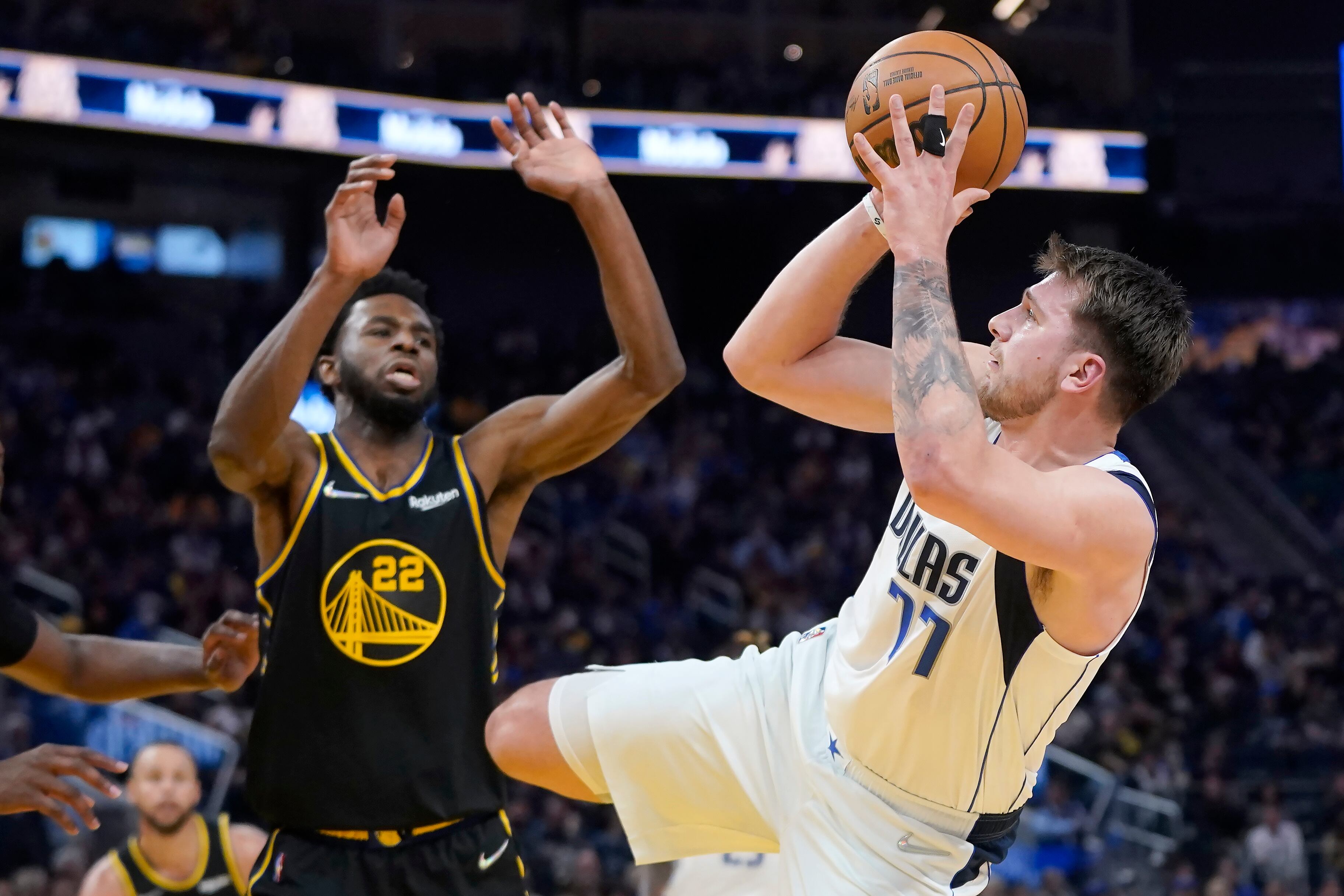 Doncic se fue 10 de 21 desde el campo en el primero de dos enfrentamientos en cinco días entre dos de las mejores defensivas de la NBA: la número uno, Golden State, y la quinta mejor, los Mavericks. Dinwiddie anotó cinco puntos seguidos a mediados del cuarto periodo para acercar a Dallas 93-90.