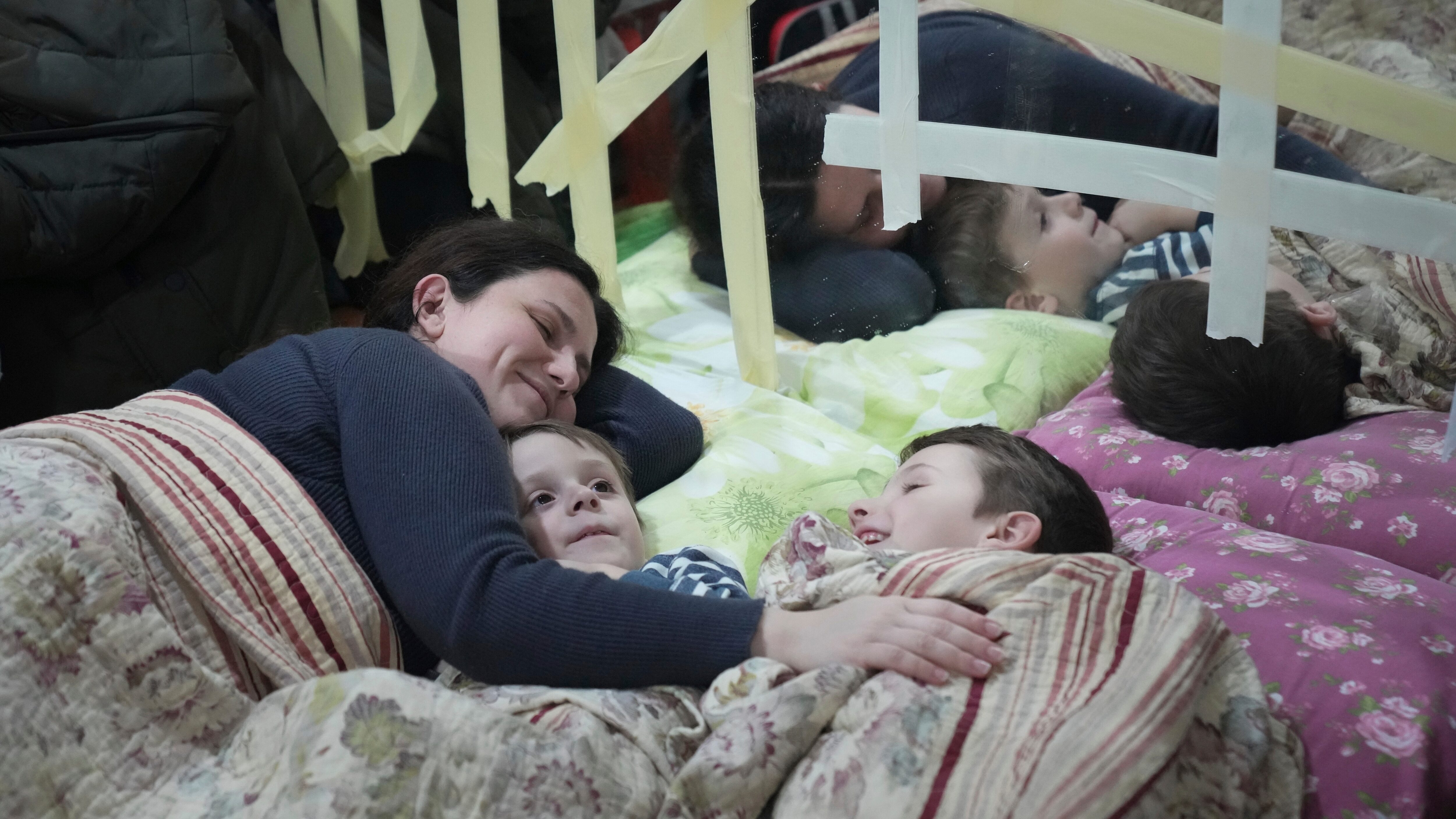 Una mujer y sus hijos acostados en el piso de un refugio antibombas improvisado en una arena con capacidad para 2.000 personas, el domingo 27 de febrero de 2022, en Mariúpol, Ucrania. (AP Foto/Evgeniy Maloletka) Una mujer y sus hijos acostados en el piso de un refugio antibombas improvisado en una arena con capacidad para 2.000 personas, el domingo 27 de febrero de 2022, en Mariúpol, Ucrania. (AP Foto/Evgeniy Maloletka) (Evgeniy Maloletka/AP)