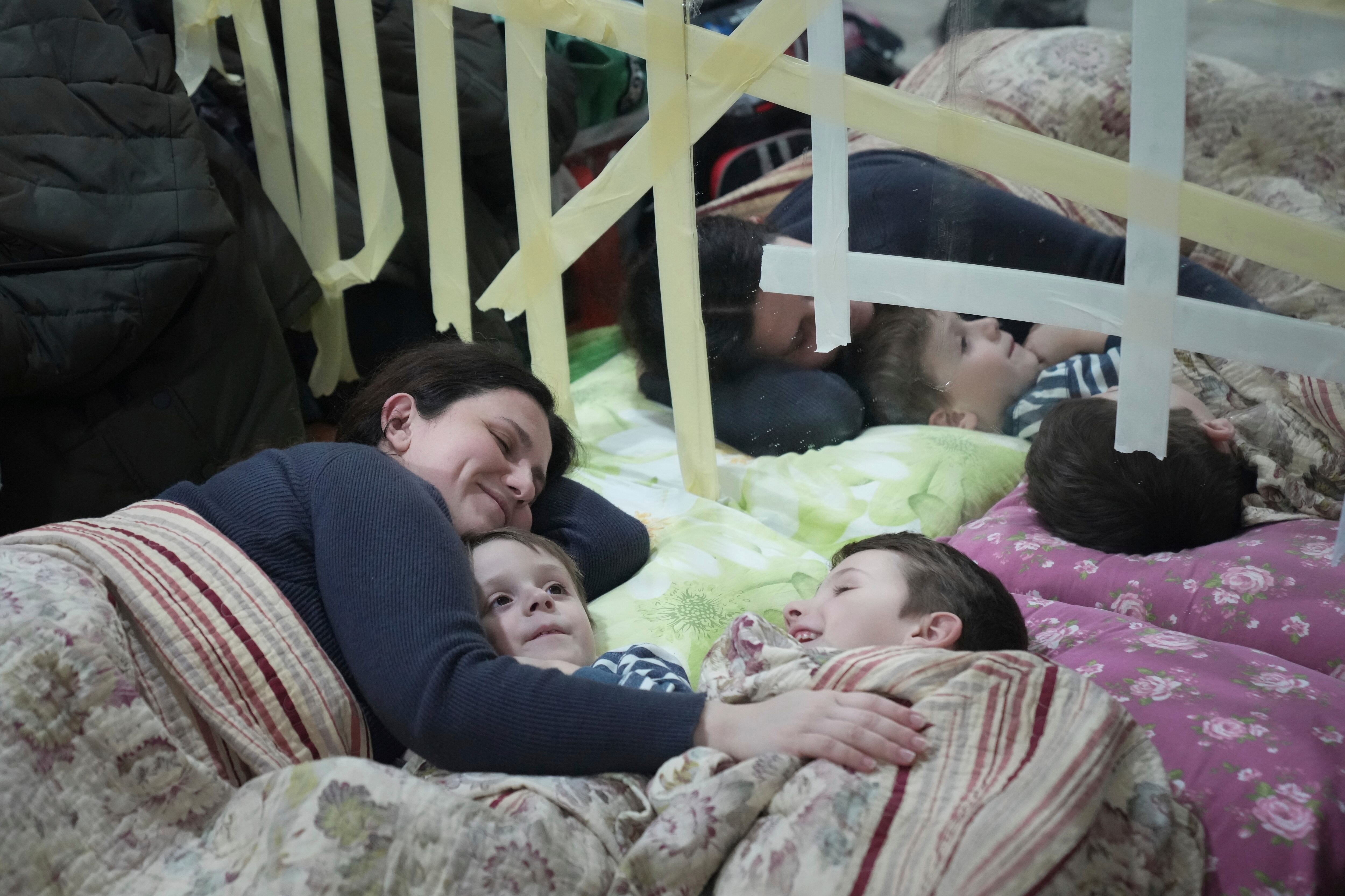 Una mujer y sus hijos acostados en el piso de un refugio antibombas improvisado en una arena con capacidad para 2.000 personas, el domingo 27 de febrero de 2022, en Mariúpol, Ucrania. (AP Foto/Evgeniy Maloletka) Una mujer y sus hijos acostados en el piso de un refugio antibombas improvisado en una arena con capacidad para 2.000 personas, el domingo 27 de febrero de 2022, en Mariúpol, Ucrania. (AP Foto/Evgeniy Maloletka) (Evgeniy Maloletka/AP)