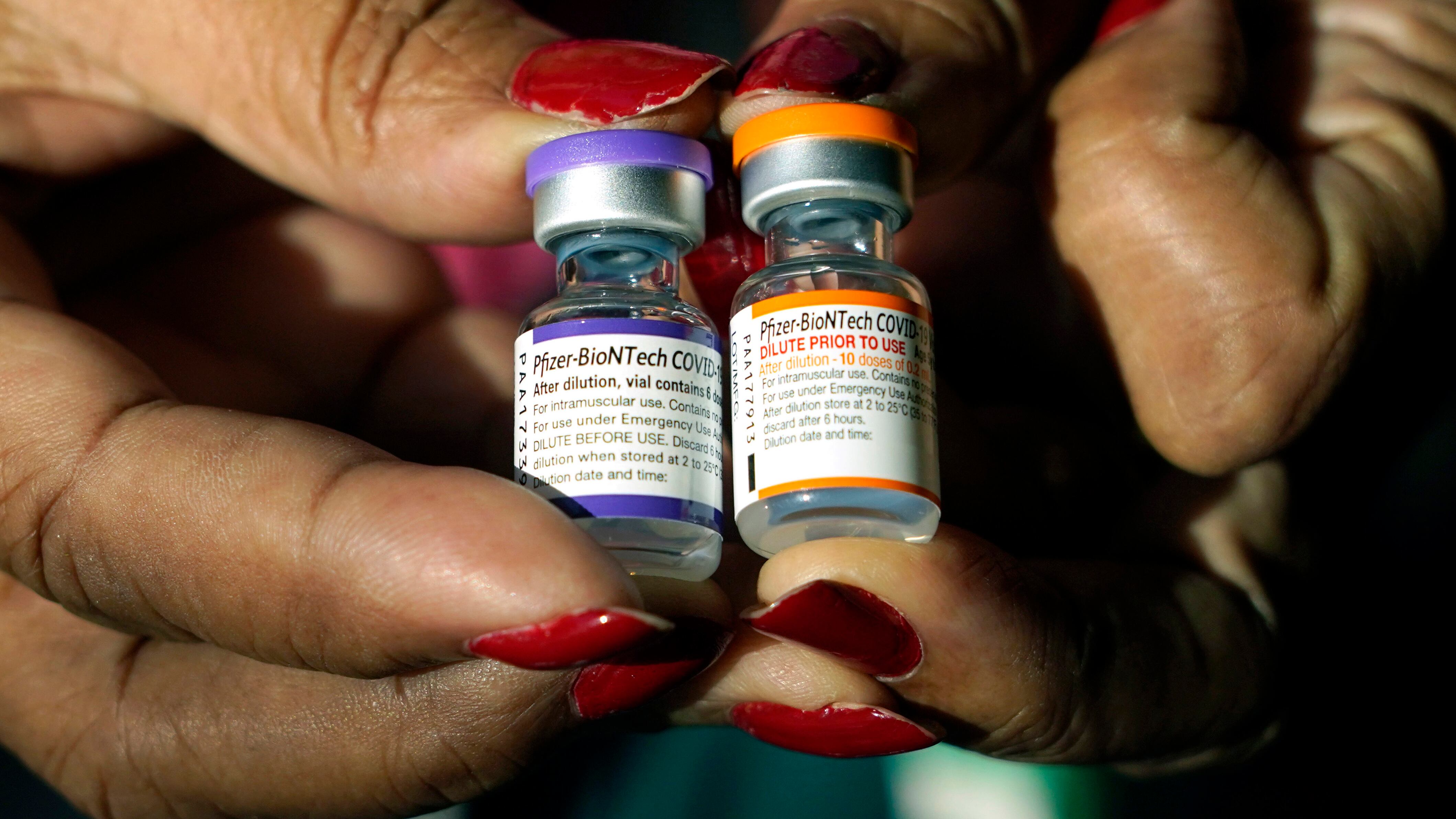 Una enfermera sostiene unos frascos de la vacuna contra el COVID-19 desarrollada por Pfizer, en Jackson, Mississippi, el martes 8 de febrero de 2022. (AP Foto/Rogelio V. Solis) Una enfermera sostiene unos frascos de la vacuna contra el COVID-19 desarrollada por Pfizer, en Jackson, Mississippi, el martes 8 de febrero de 2022. (AP Foto/Rogelio V. Solis) (Rogelio V. Solis/AP)