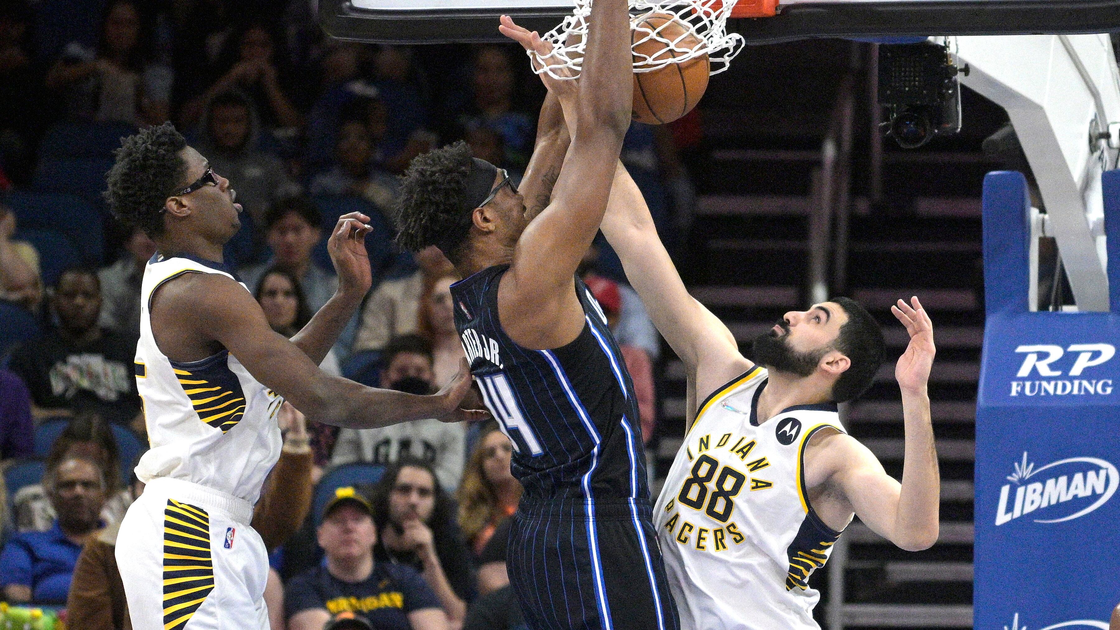 El pivot del Magic de Orlando Wendell Carter Jr. clava el balón mientras lo defiende el alero Jalen Smith y el pivot Goga Bitadze de los Pacers de Indiana en el encuentro del lunes 28 de febrero del 2022 en Orlando, Florida. (AP Foto/Phelan M. Ebenhack) El pivot del Magic de Orlando Wendell Carter Jr. clava el balón mientras lo defiende el alero Jalen Smith y el pivot Goga Bitadze de los Pacers de Indiana en el encuentro del lunes 28 de febrero del 2022 en Orlando, Florida. (AP Foto/Phelan M. Ebenhack) (Phelan M. Ebenhack/AP)