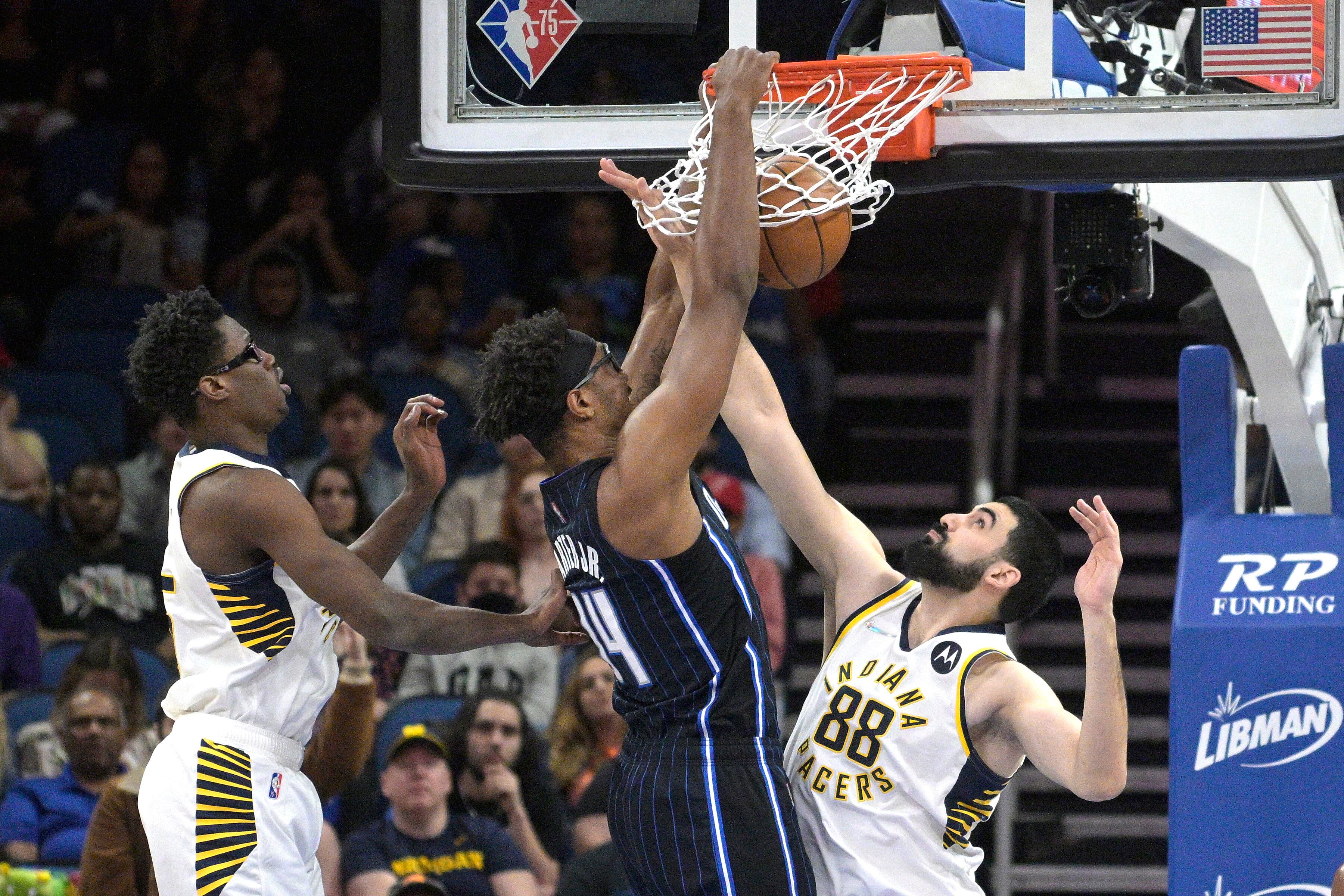 El pivot del Magic de Orlando Wendell Carter Jr. clava el balón mientras lo defiende el alero Jalen Smith y el pivot Goga Bitadze de los Pacers de Indiana en el encuentro del lunes 28 de febrero del 2022 en Orlando, Florida. (AP Foto/Phelan M. Ebenhack) El pivot del Magic de Orlando Wendell Carter Jr. clava el balón mientras lo defiende el alero Jalen Smith y el pivot Goga Bitadze de los Pacers de Indiana en el encuentro del lunes 28 de febrero del 2022 en Orlando, Florida. (AP Foto/Phelan M. Ebenhack) (Phelan M. Ebenhack/AP)