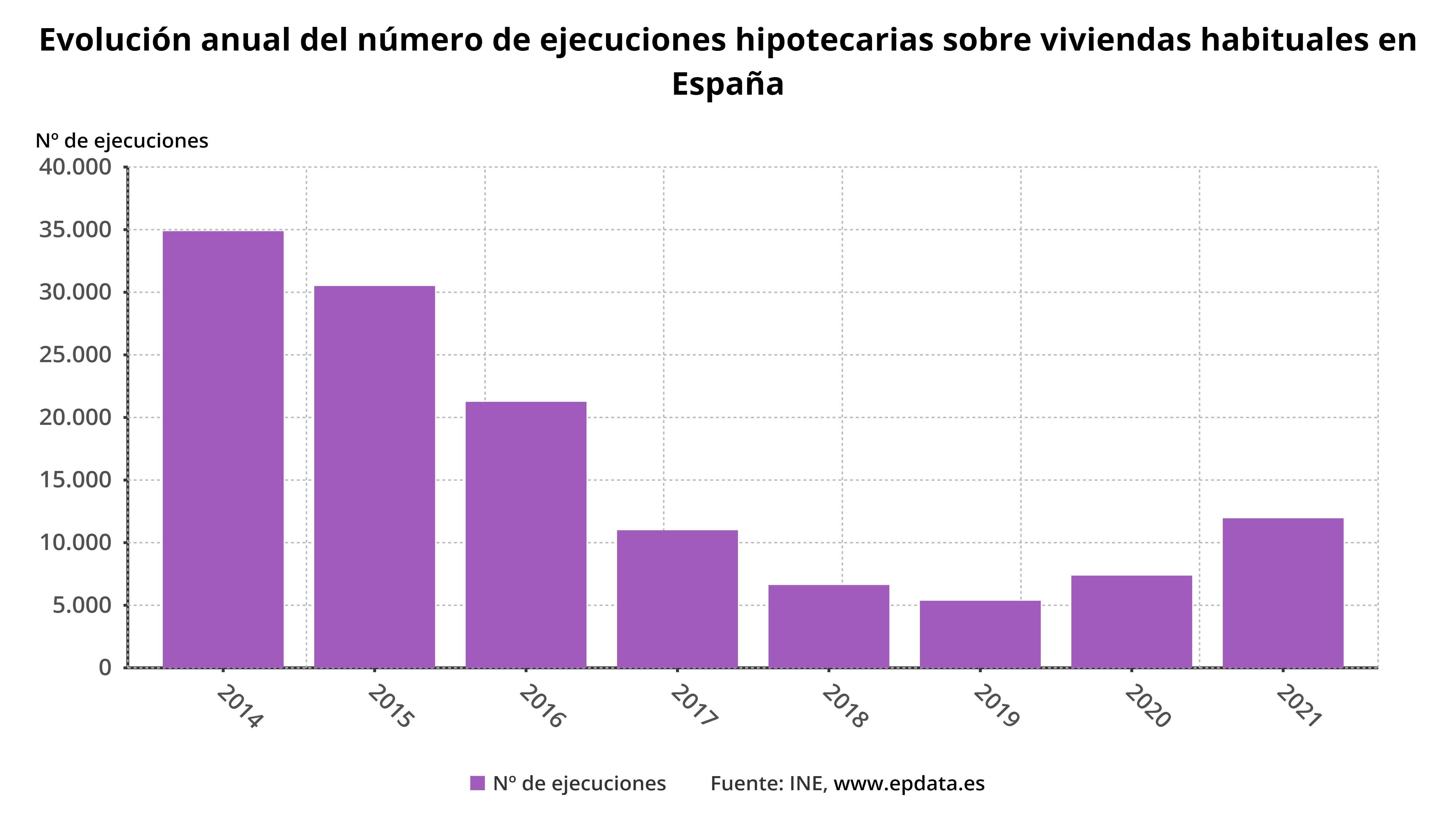El número de ejecuciones hipotecarias sobre viviendas habituales se situó en 11.947 en 2021, cifra que es la más elevada desde 2016 y que supone un incremento del 57,4% respecto a 2020, su mayor repunte anual desde el inicio de la serie, en 2014, según la estadística de ejecuciones hipotecarias publicada este lunes por el Instituto Nacional de Estadística (INE).