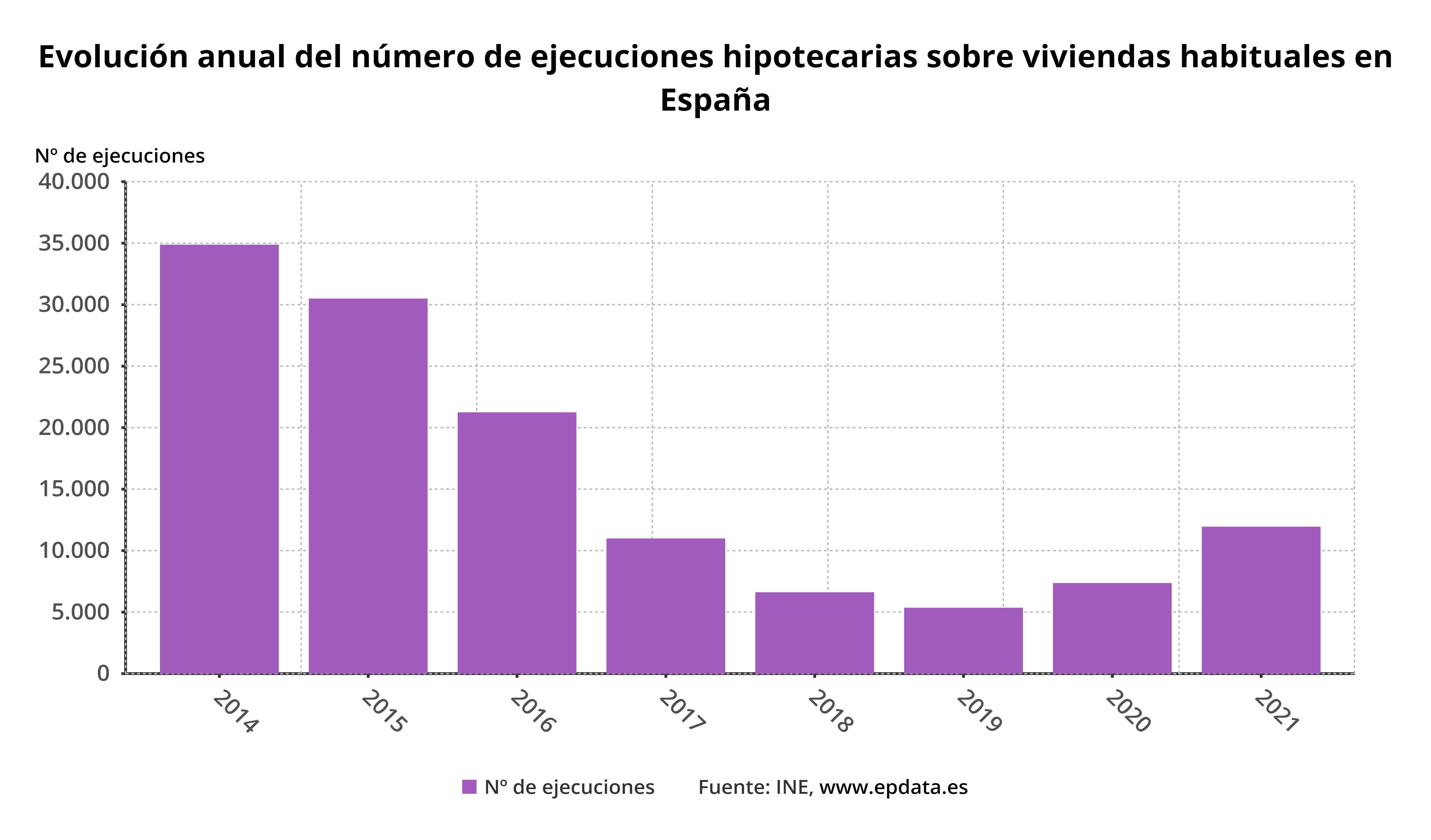 El número de ejecuciones hipotecarias sobre viviendas habituales se situó en 11.947 en 2021, cifra que es la más elevada desde 2016 y que supone un incremento del 57,4% respecto a 2020, su mayor repunte anual desde el inicio de la serie, en 2014, según la estadística de ejecuciones hipotecarias publicada este lunes por el Instituto Nacional de Estadística (INE).