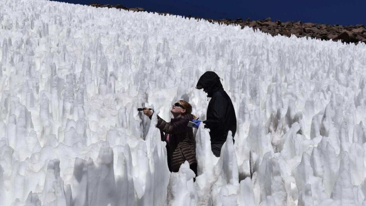 Solon y Steckel se aventuraron en un laberinto gigante y congelado de púas heladas parecidas a estalagmitas llamadas penitentes para realizar su investigación. Desde unas pocos centímetros hasta dos metroas de alto, estas maravillas nevadas existen no solo a pesar de, sino como resultado de las condiciones extremas, brindando una rara oportunidad de comprender cómo la vida puede prosperar allí. Solo se han muestreado en otros dos volcanes de la región, en expediciones dirigidas por Schmidt.