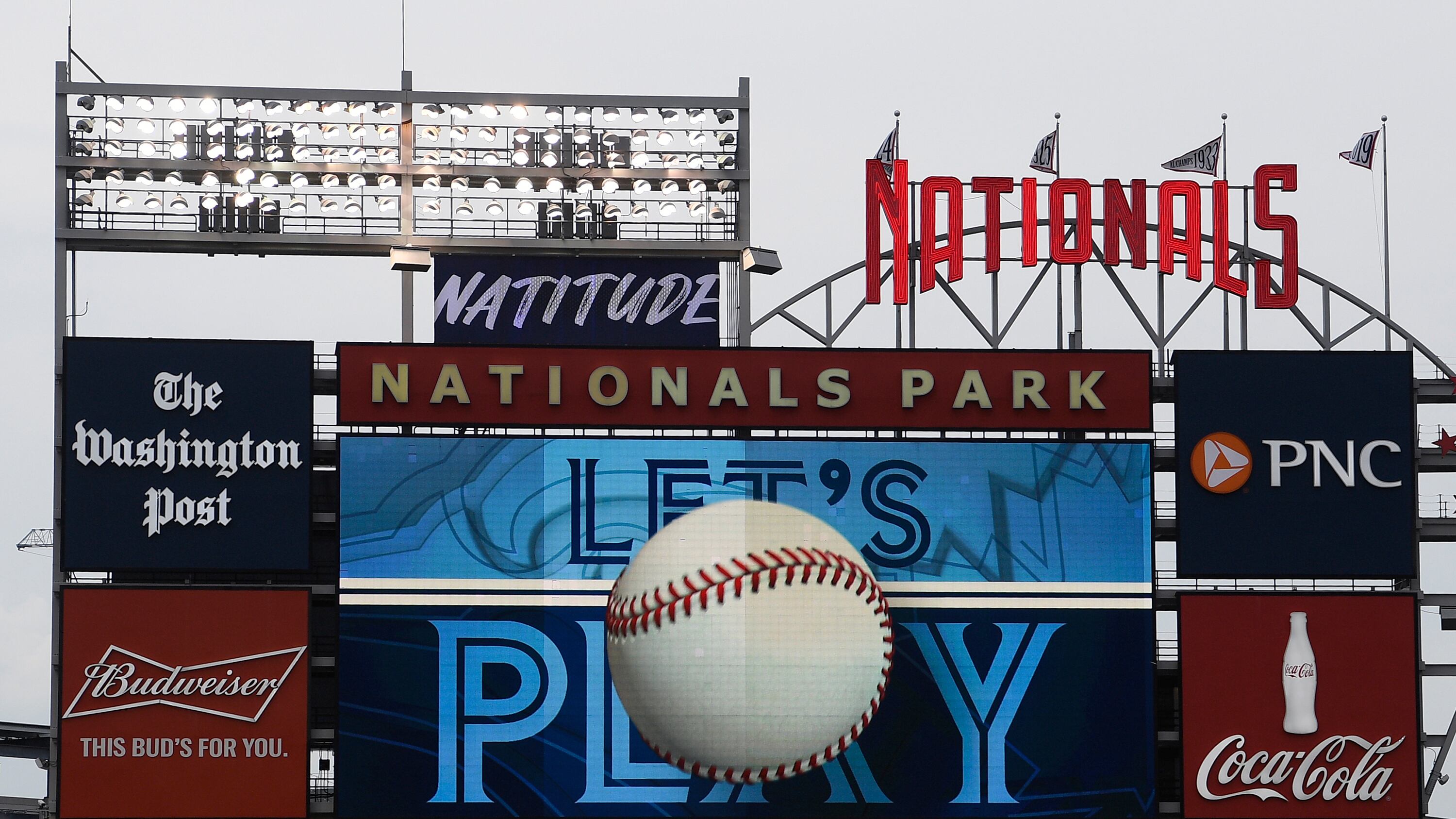 ARCHIVO - El marcador muestra imágenes durante la séptima entrada de un partido de los Azulejos de Toronto ante los Nacionales de Washington, el 30 de julio de 2020, en Washington. (AP Foto/Nick Wass, archivo) (Nick Wass/AP)