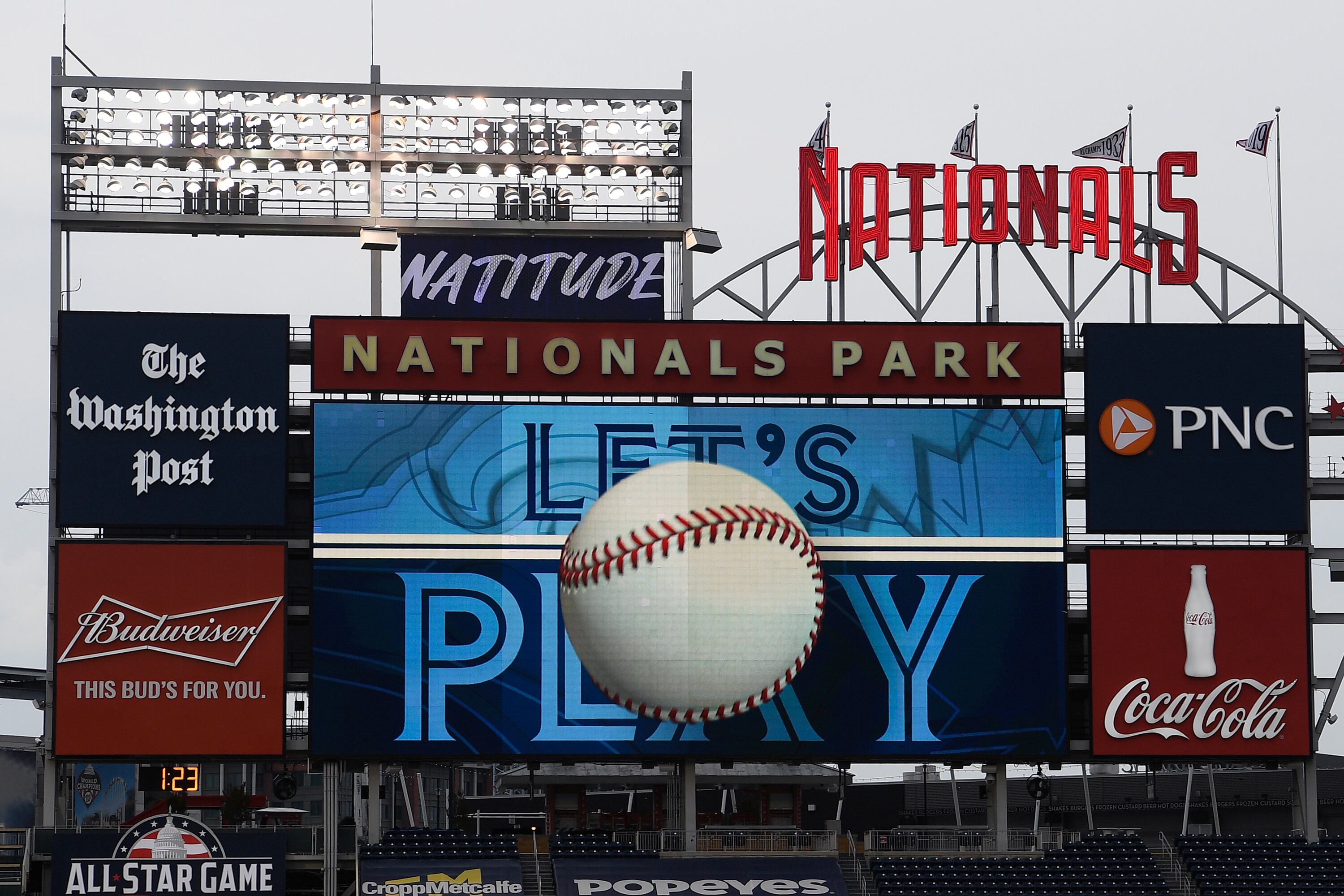 ARCHIVO - El marcador muestra imágenes durante la séptima entrada de un partido de los Azulejos de Toronto ante los Nacionales de Washington, el 30 de julio de 2020, en Washington. (AP Foto/Nick Wass, archivo) (Nick Wass/AP)