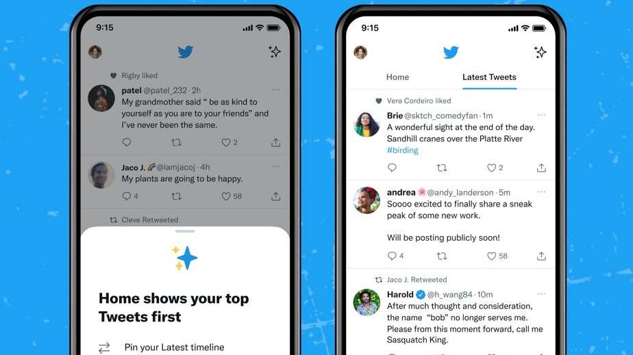 En la aplicación para iOS, y «pronto» también en Android y la web, Twitter ha rediseñado la página de inicio para mostrar dos pestañas: inicio y los últimos, entre los que el usuario puede moverse para revisar todas las publicaciones.