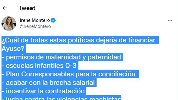 «¿Cuál de todas estas políticas dejaría de financiar Ayuso?», se pregunta Montero en su perfil de Twitter para indicar a continuación a la presidenta madrileña varias opciones. «Permisos de maternidad y paternidad, escuelas infantiles 0-3, Plan Corresponsables para la conciliación, acabar con la brecha salarial, incentivar la contratación, lucha contra las violencias machistas», ha escrito Ayuso en Twitter.