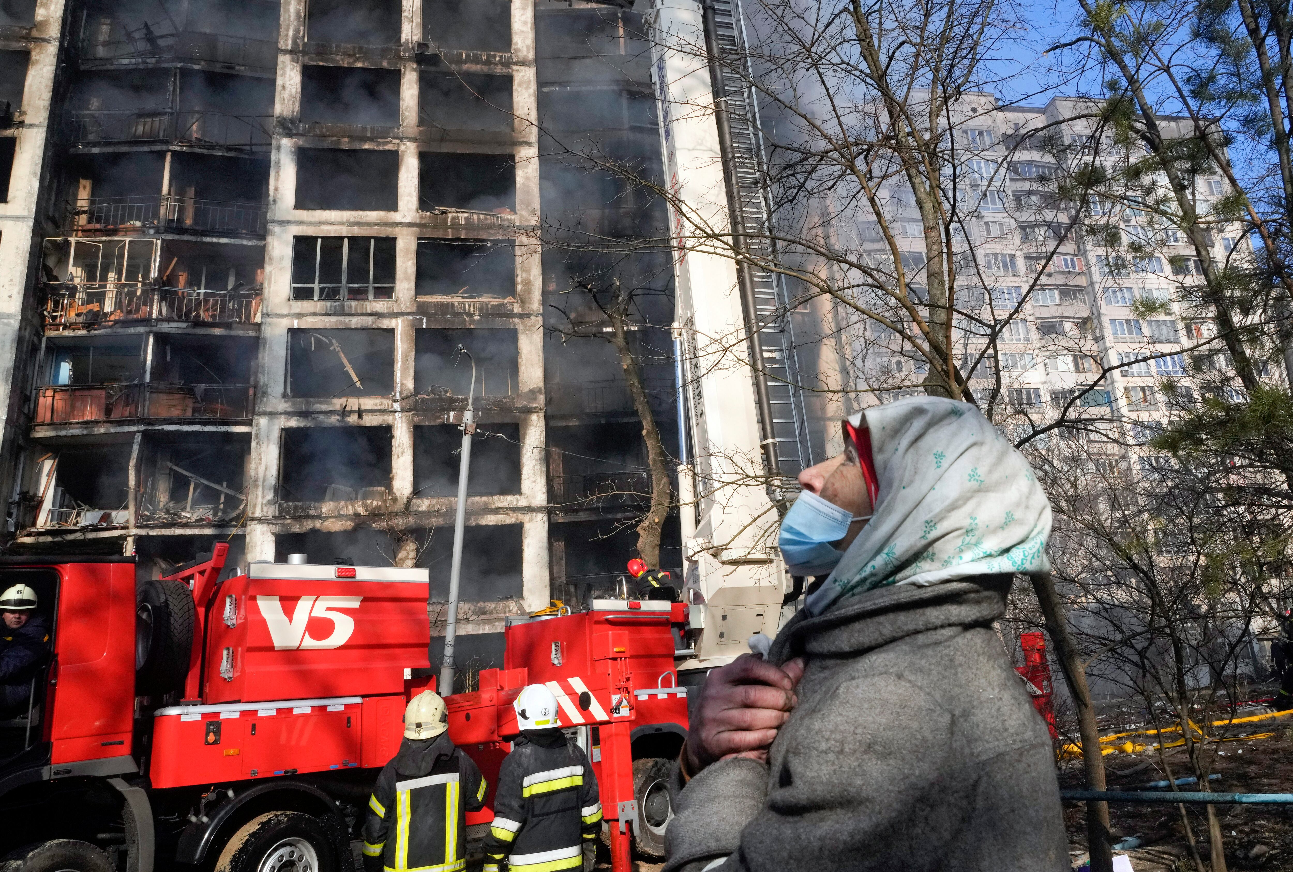 Una mujer reacciona junto a un edificio destruido por un ataque ruso a una zona residencial de Kiev del 15 de marzo del 2022. Los primeros ministros de Polonia, Eslovenia y la República Checa viajaban el martes en tren a Kiev para mostrar su respaldo a U (Efrem Lukatsky/AP)