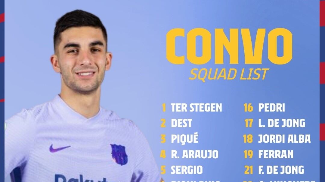 La lista de convocados para la ‘final’ en Estambul está integrada por Ter Stegen, Dest, Piqué, Araujo, Sergio Busquets, Riqui Puig, Dembélé, Memphis, Adama, Braithwaite, Neto, Lenglet, Pedri, L. De Jong, Jordi Alba, Ferran, F. De Jong, Mingueza, Eric, Aubameyang, Nico, Gavi y Arnau Tenas.