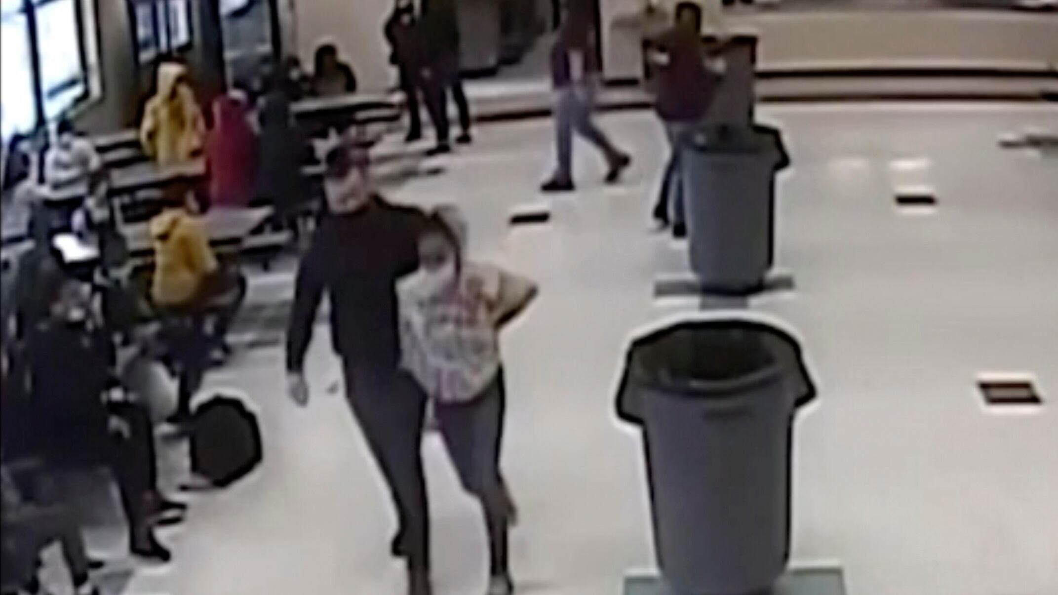 Luego, Guetschow, que trabajaba como guardia de seguridad en la escuela, presiona la cabeza de la niña contra el piso y coloca su rodilla en su cuello durante medio minuto aproximadamente, antes de esposarla y sacarla de la cafetería.