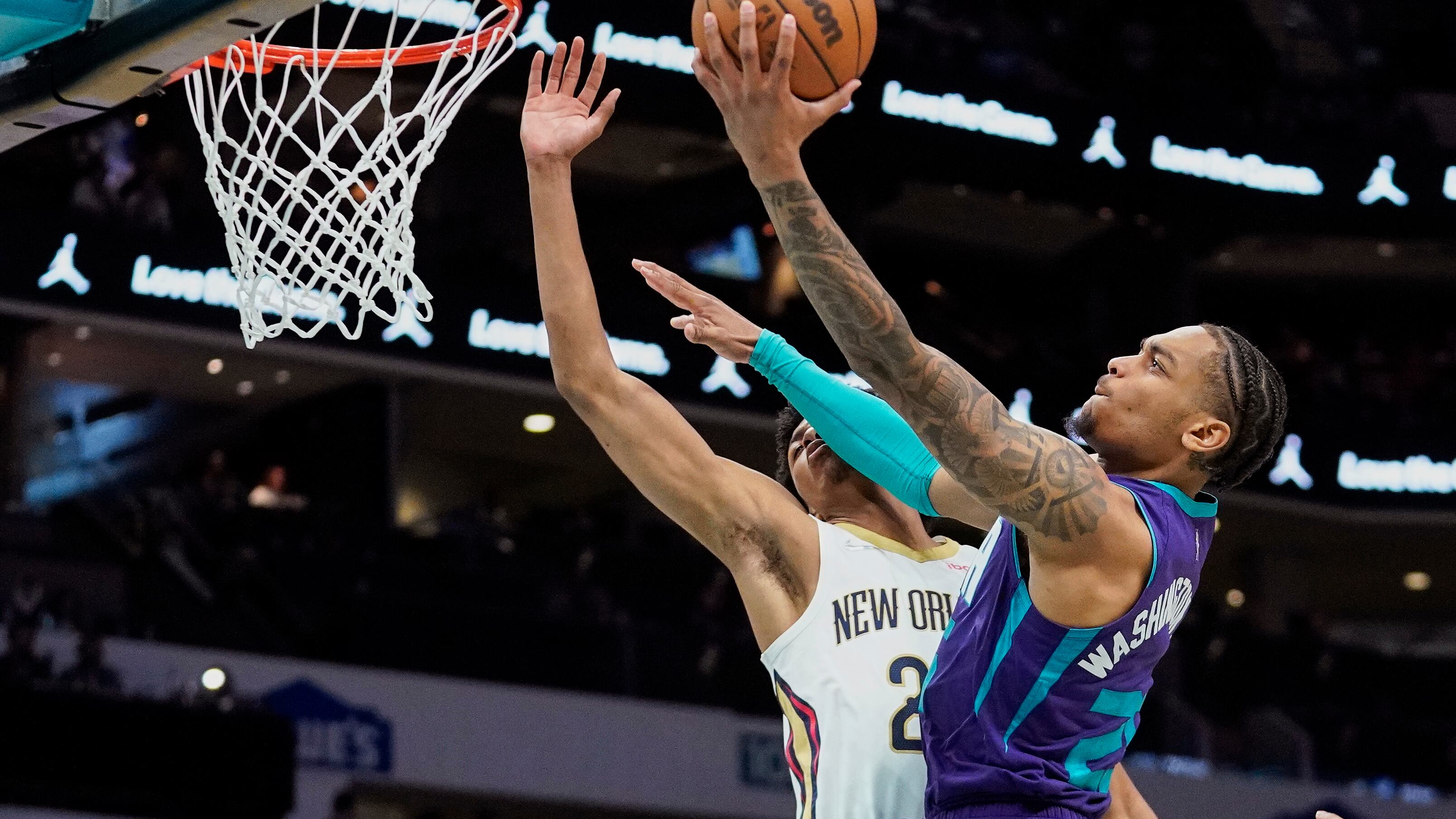Jaxson Hayes le regresó la delantera a los Pelicans con un par de tiros libres, pero P.J. Washington anotó y luego encontró a Plumlee cortando por el centro para una canasta que puso a Charlotte al frente.