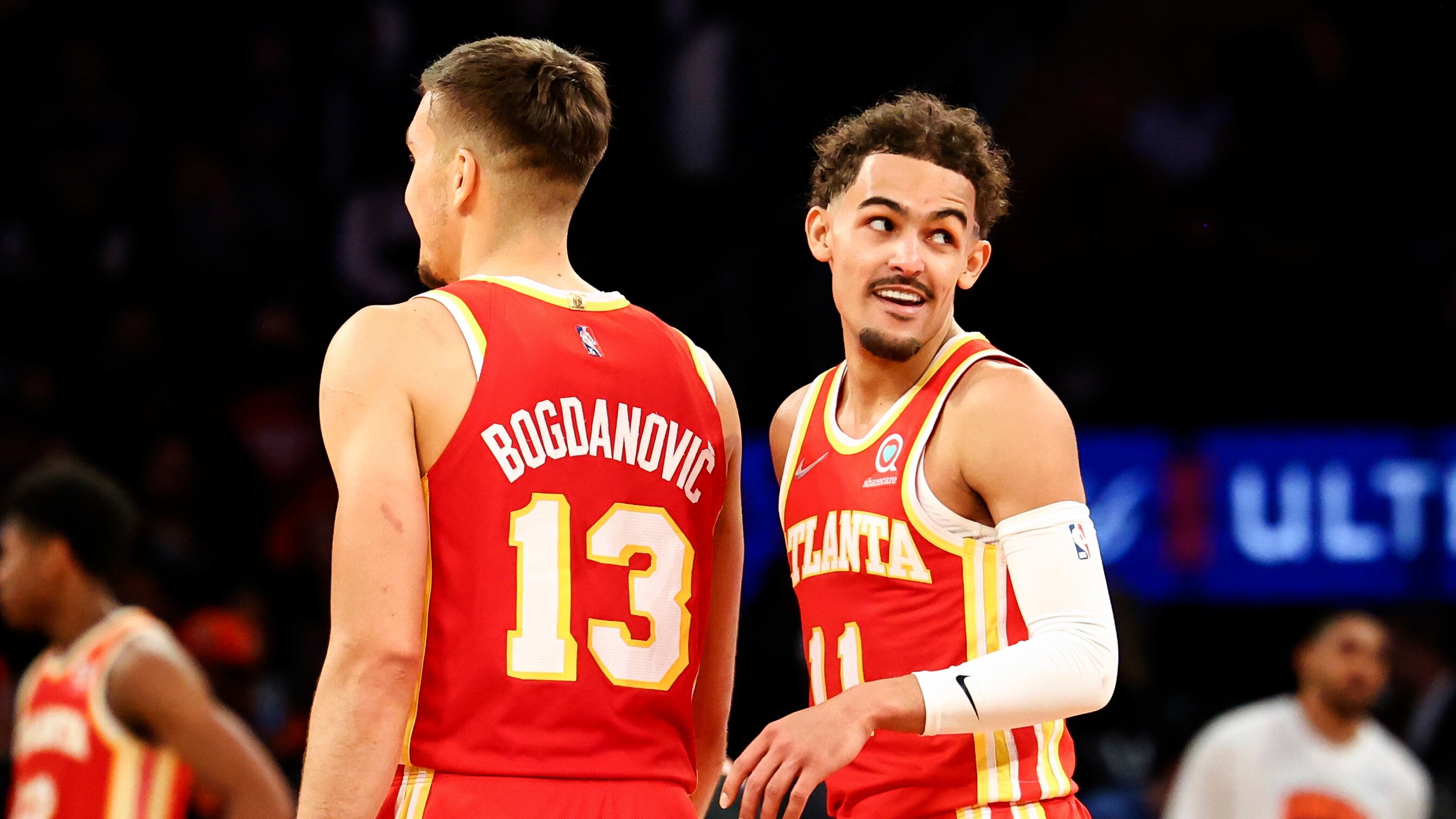 Trae Young, base de los Hawks de Atlanta, sonríe junto a su compañero Bogdan Bogdanovic, durante el partido del martes 22 de marzo de 2022, ante los Knicks de Nueva York (AP Foto/Jessie Alcheh) (Jessie Alcheh/AP)