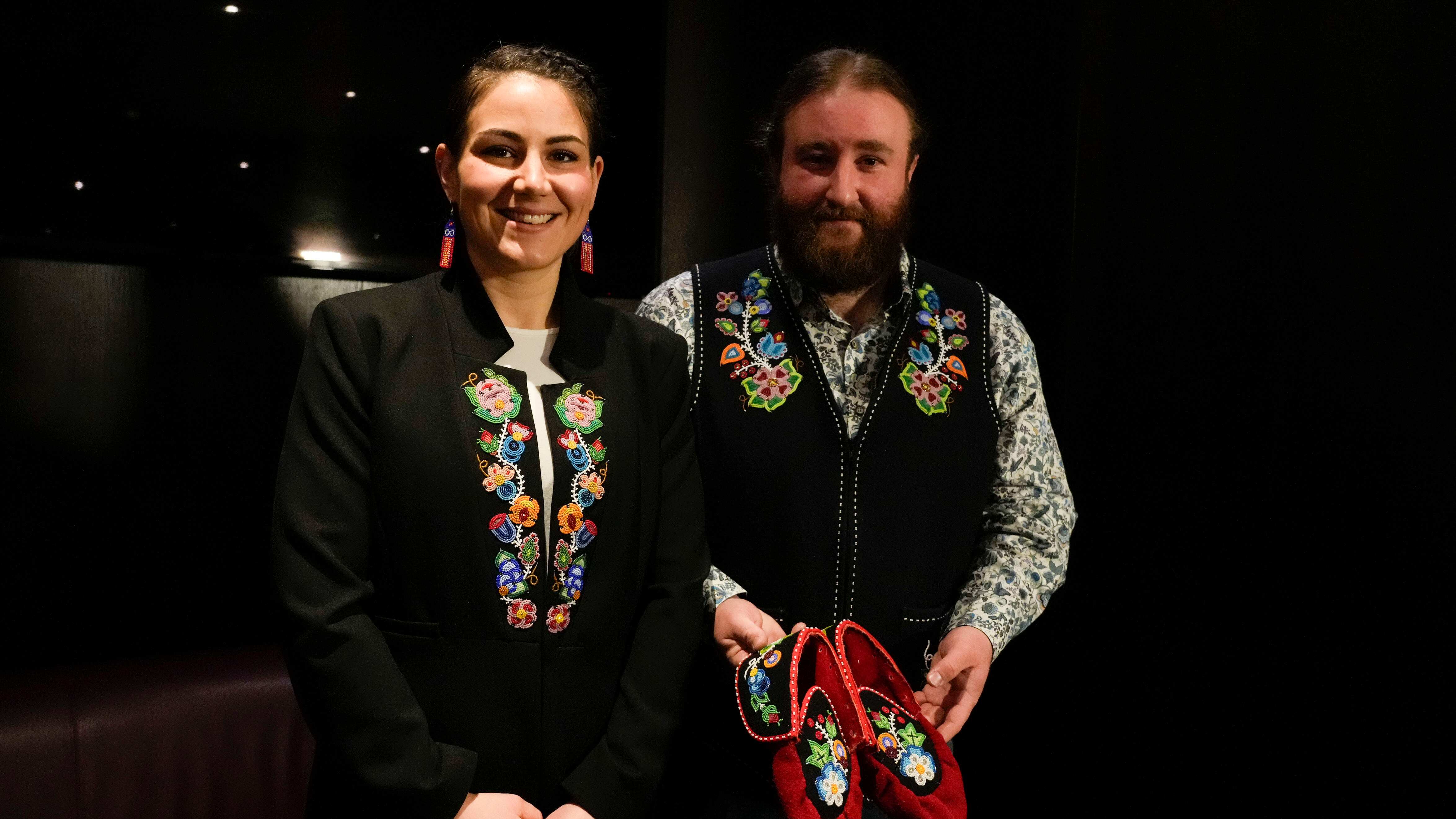 Mitchell Case, historiadora y educadora de la comunidad y concejal de la Región 4, en la Nación Métis de Ontario, y el presidente de la Comunidad Métis, Cassidy Caron, posan para la prensa mostrando unos mocasines tradicionales métis como obsequio pa (Gregorio Borgia/AP)