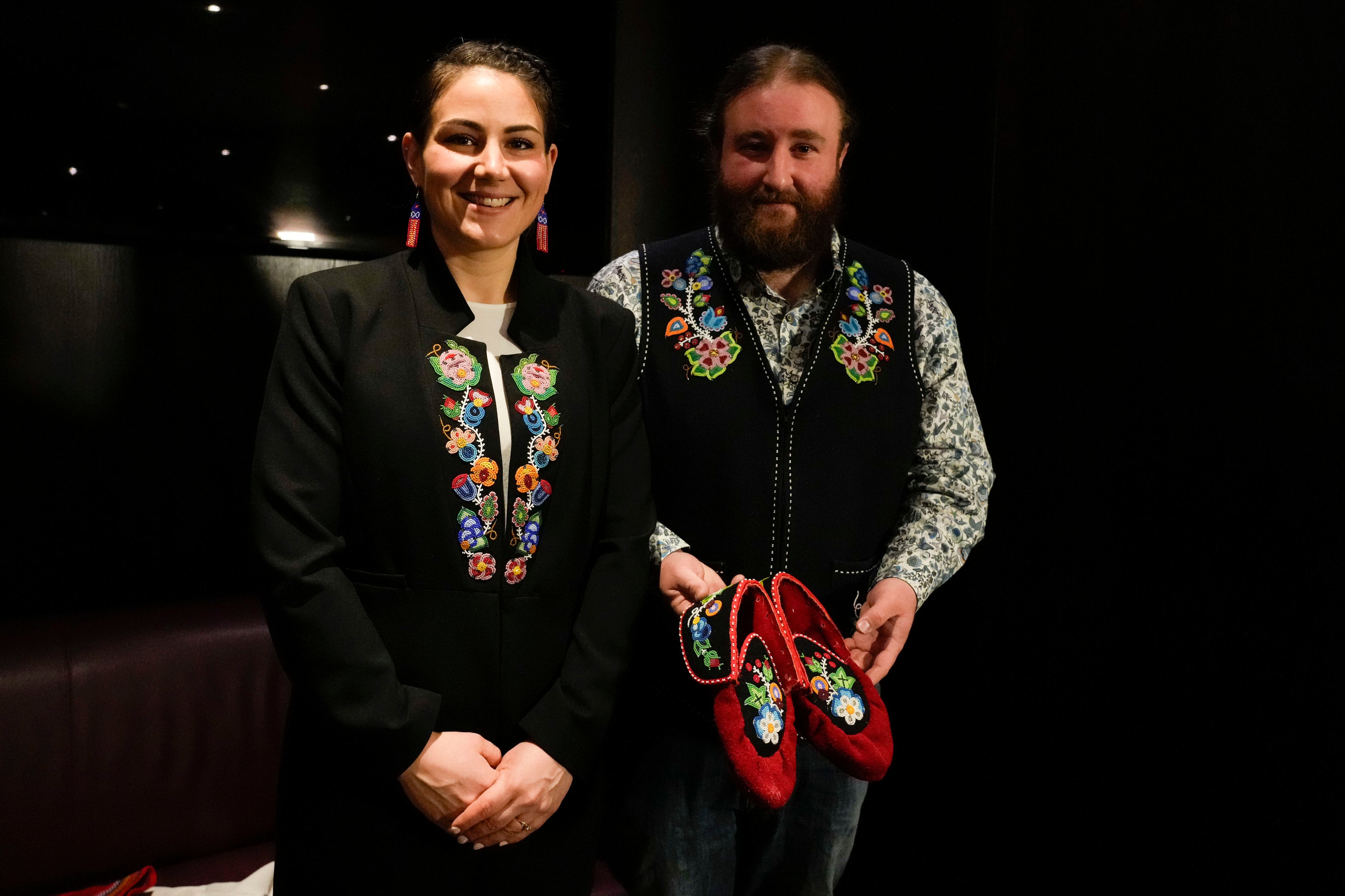 Mitchell Case, historiadora y educadora de la comunidad y concejal de la Región 4, en la Nación Métis de Ontario, y el presidente de la Comunidad Métis, Cassidy Caron, posan para la prensa mostrando unos mocasines tradicionales métis como obsequio pa (Gregorio Borgia/AP)