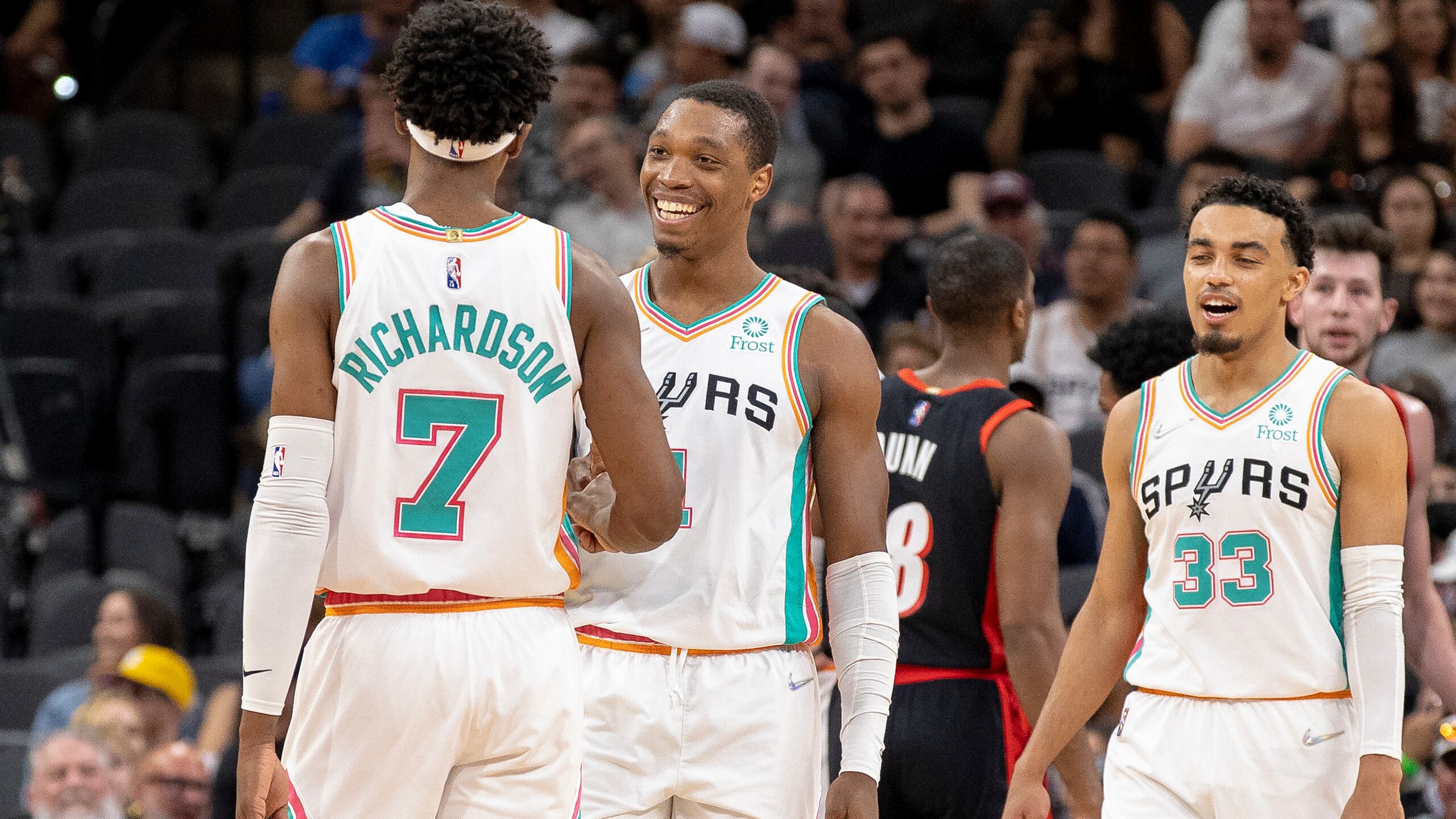 Lonnie Walker IV (centro), base de los Spurs de San Antonio, festeja con su compañero Josh Richardson durante el encuentro ante los Trail Blazers de Portland, el viernes 1 de abril de 2022 (AP Foto/Nick Wagner) (Nick Wagner/AP)
