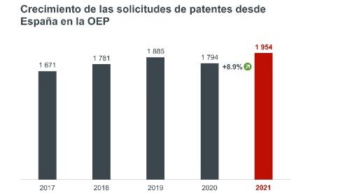 En total, se registraron 1.954 patentes en España en 2021, un nuevo récord histórico, que coincide con un incremento muy superior al de la media de la Unión Europea, que se quedó en un aumento del 2,7%.