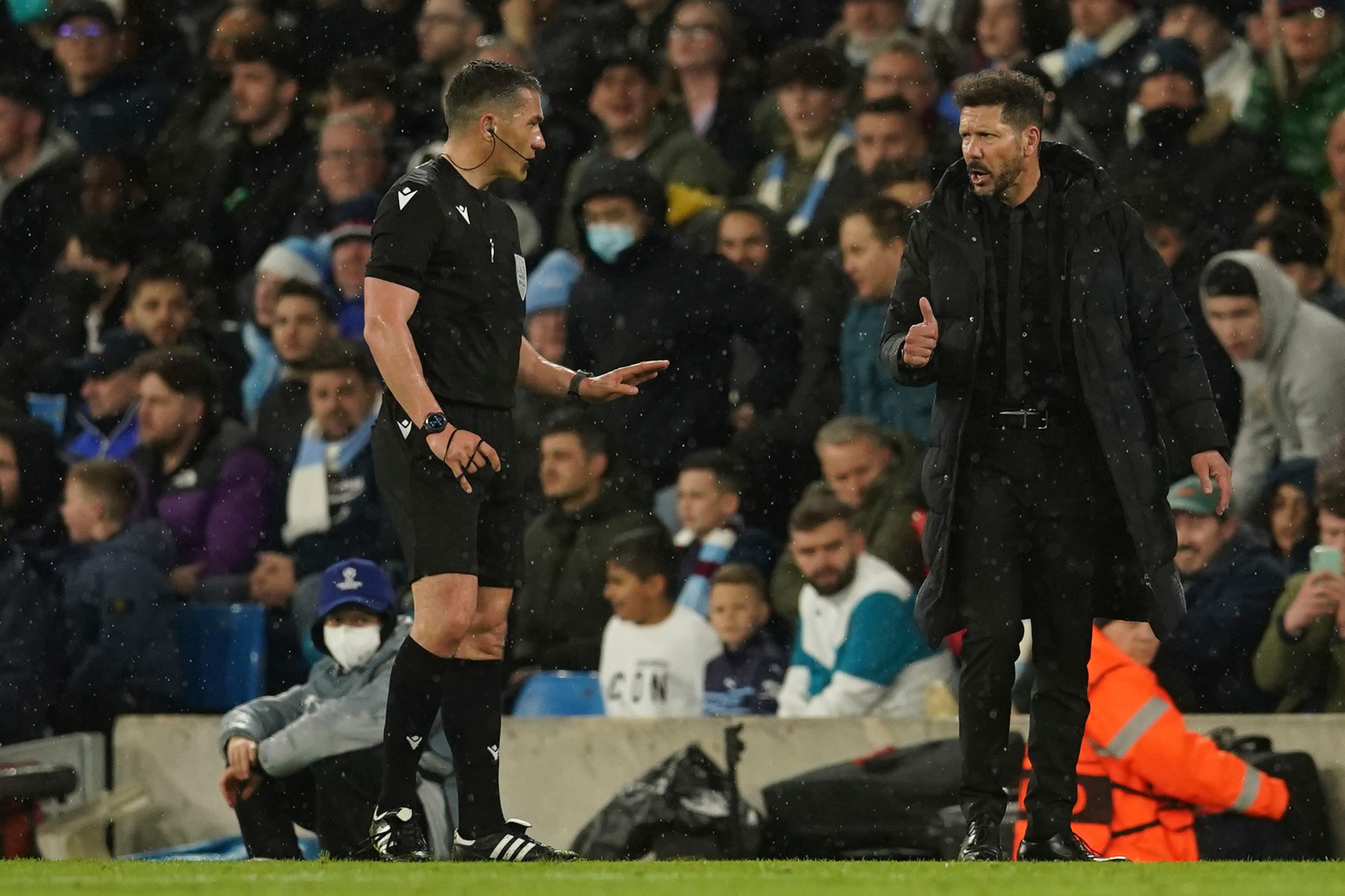 El técnico del Atlético de Madrid Diego Simeone (izquierda) charla con el árbitro Istvan Kovacs durante el partido contra Manchester City en la Liga de Campeones, el martes 5 de abril de 2022, en el Estadio Etihad. (AP Foto/Dave Thompson) (Dave Thompson/AP)