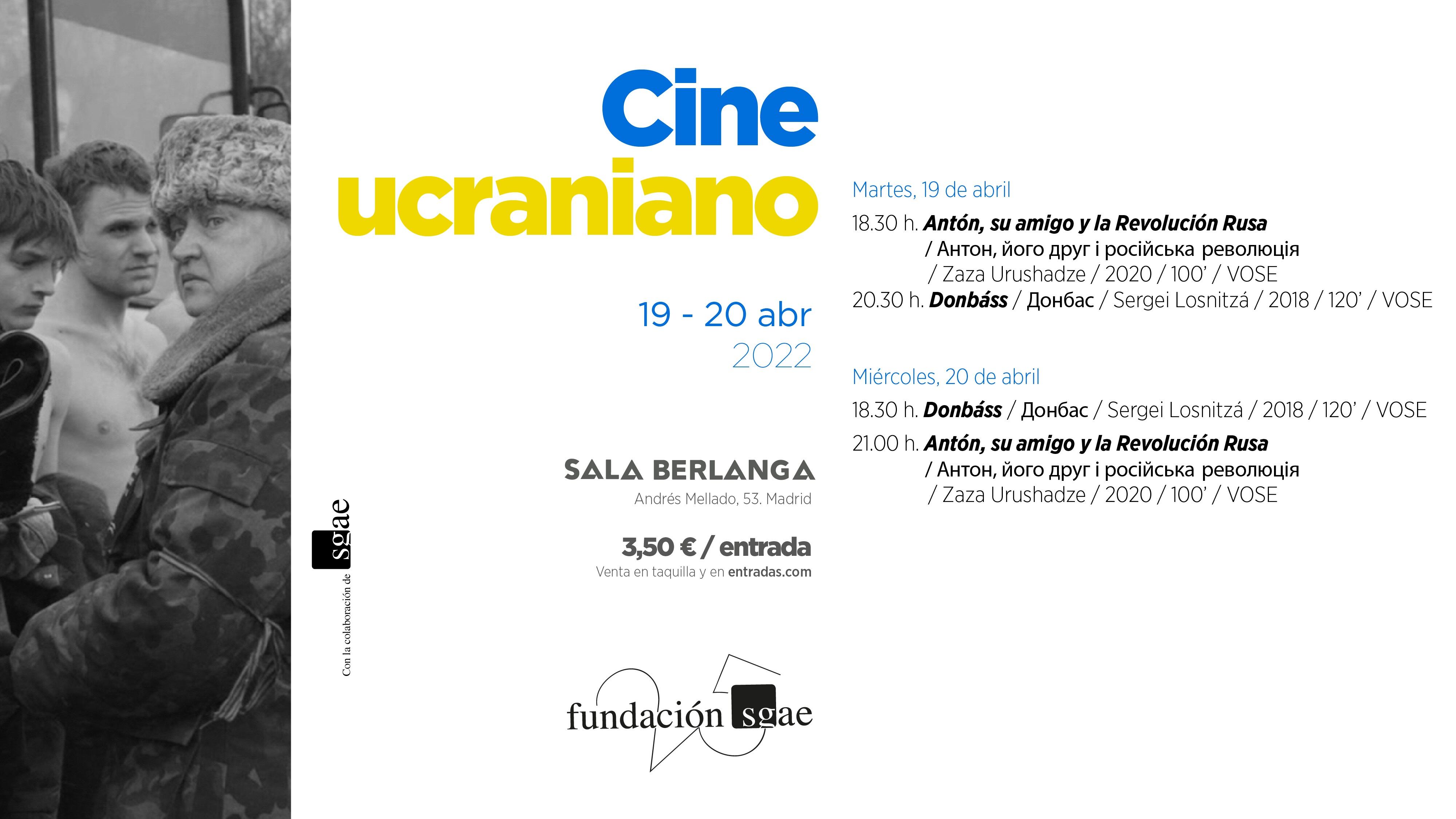 La Fundación SGAE ha programado los días 19 y 29 de abril en la Sala Berlanga de Madrid un ciclo de cine afín a Ucrania, que incluirá la proyección de la película ‘Antón, su amigo y la Revolución Rusa’, de Zaza Urushadze, y el documental ‘Donbáss’, de Sergei Losnitzá.