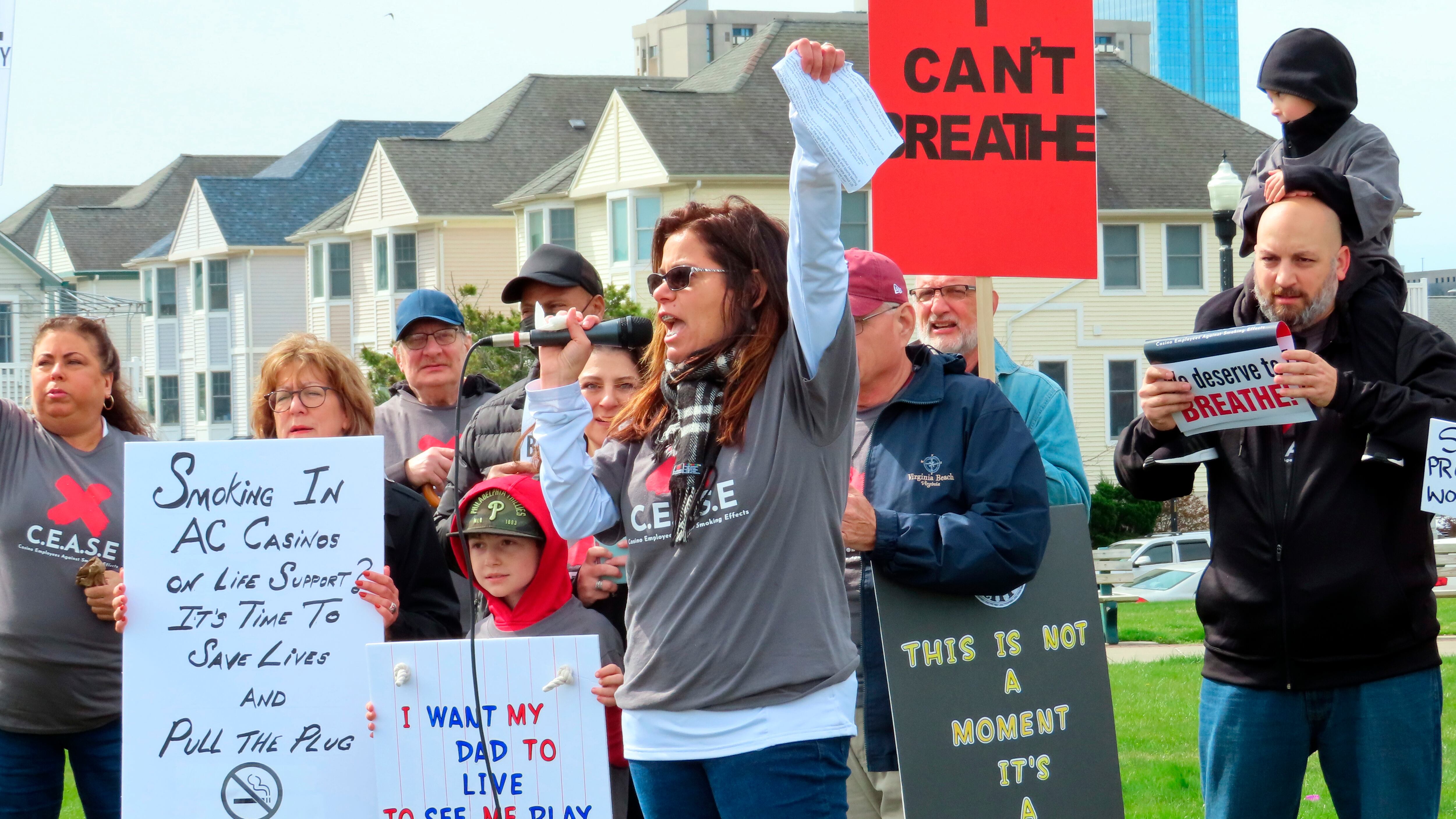 Unos 250 trabajadores de casinos se congregaron el martes en un parque cerca del océano para llamar a los legisladores a aprobar una propuesta de ley que pondría fin a la exención de los casinos de la prohibición de fumar en interiores públicos.