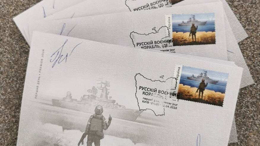 Ukrposhta ha publicado así un millón de sellos de tirada bajo el título «¡Buque de guerra ruso, vete a la mierda!» que se refiere en particular a los guardias de fronteras de la isla de la Serpiente, tomada por las fuerzas rusas en los primeros días de la invasión rusa.