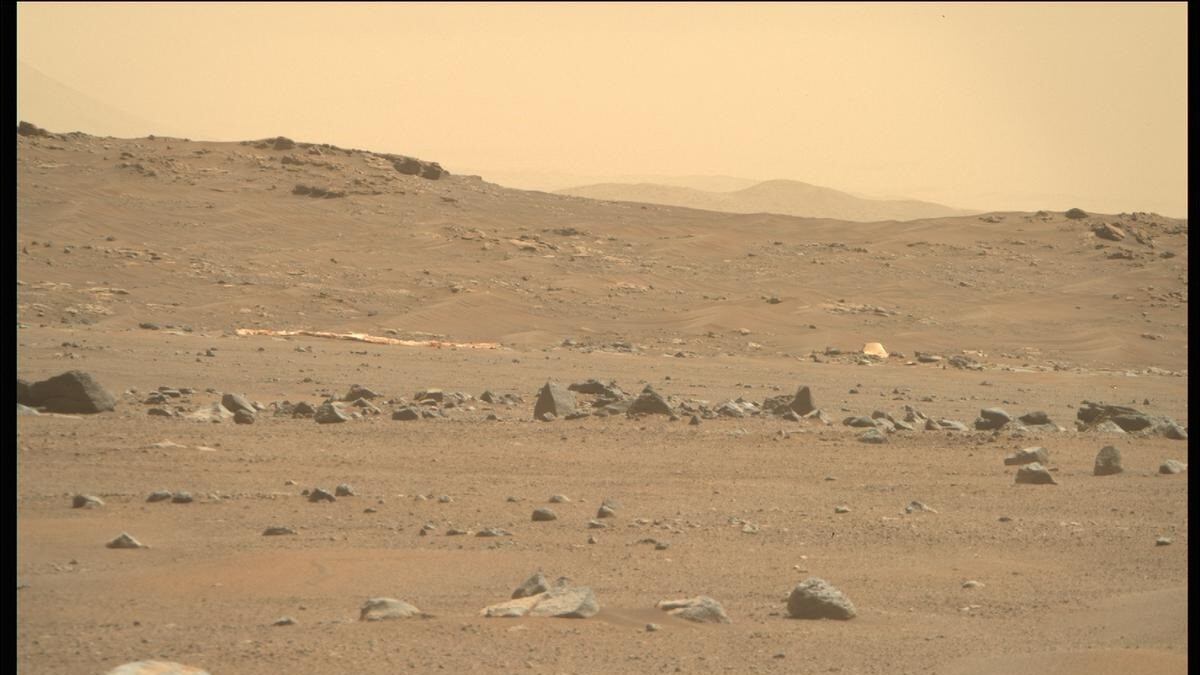 El paracaídas y la carcasa trasera fueron fotografiados por MastCam-Z de Perseverance, vistos en la distancia, justo al sur de la ubicación actual del rover. La imagen fue tomada el Sol 404, o el 6 de abril de 2022 en la Tierra.
