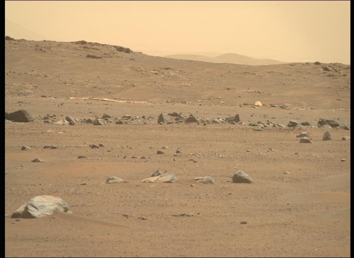 El paracaídas y la carcasa trasera fueron fotografiados por MastCam-Z de Perseverance, vistos en la distancia, justo al sur de la ubicación actual del rover. La imagen fue tomada el Sol 404, o el 6 de abril de 2022 en la Tierra.