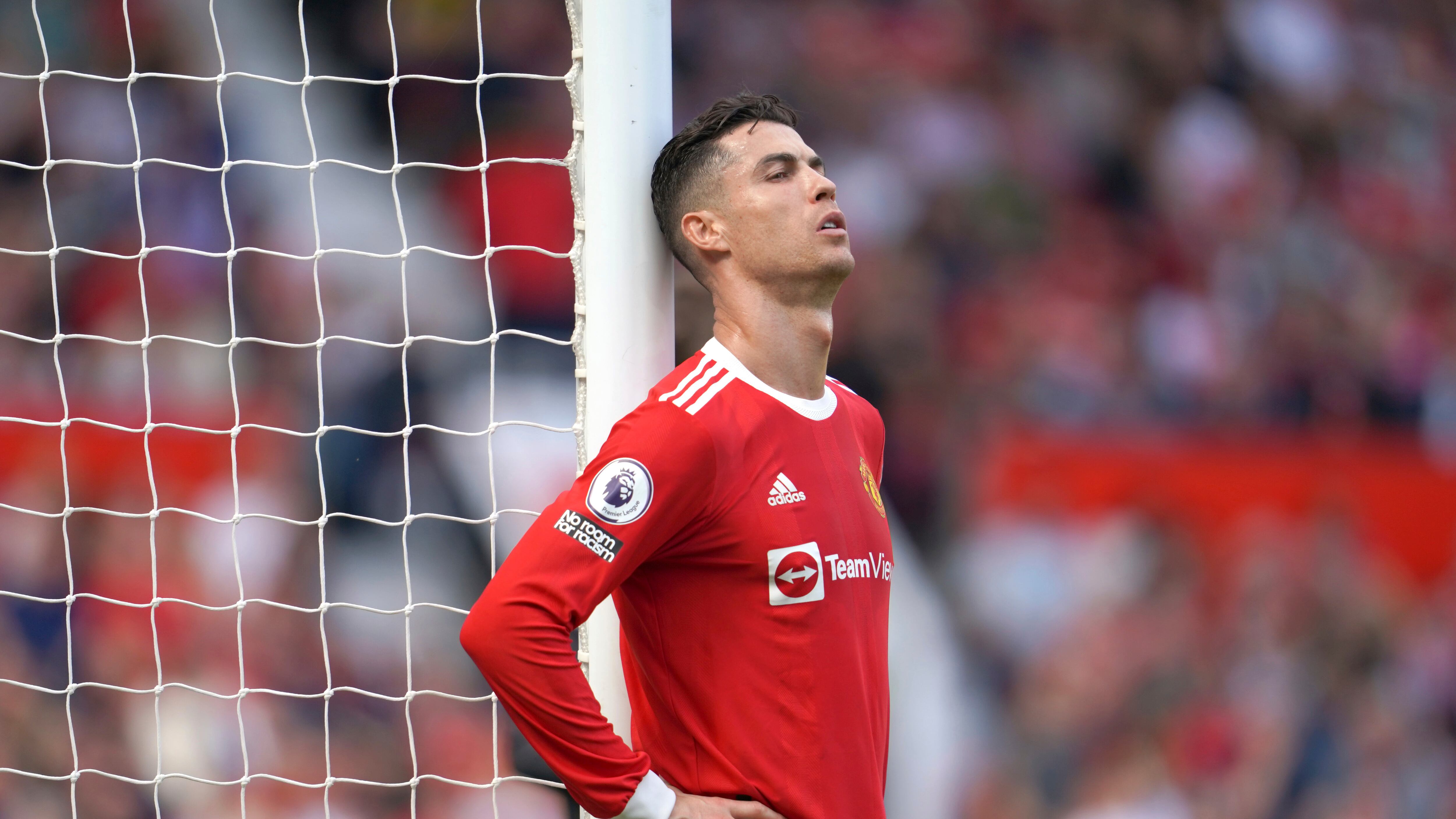 Cristiano Ronaldo del Manchester United descansa junto a la portería en un partido de la Liga Premier entre el Manchester United y Norwich City en el estadio Old Trafford en Manchester, Inglaterra, el 16 de abril de 2022. Ronaldo y su esposa Georgina Rod (Jon Super/AP)