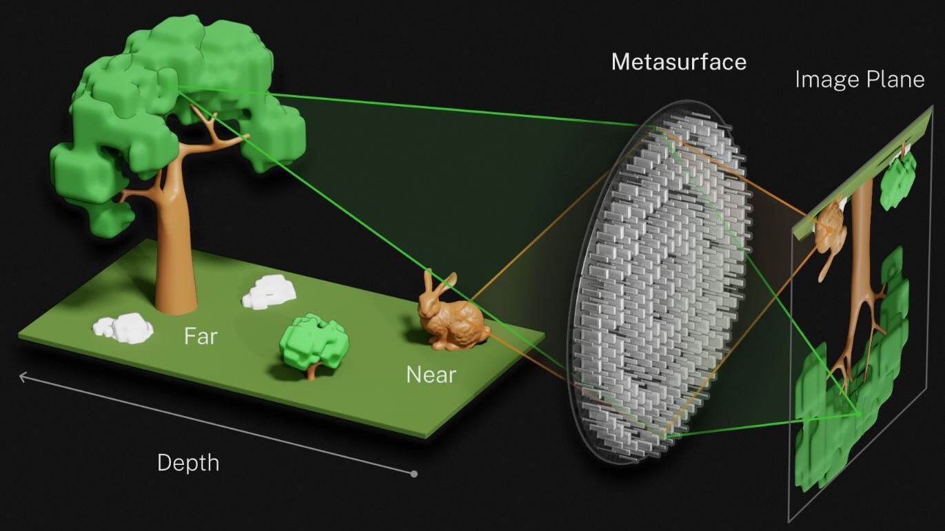 Los investigadores fabricaron una serie de lentes diminutas conocidas como metalenses. Estas son películas ultrafinas grabadas o impresas con grupos de pilares a nanoescala diseñados para manipular la luz de formas específicas. Para diseñar sus metalenses, Agrawal y sus colegas tachonaron una superficie plana de vidrio con millones de diminutos pilares rectangulares de escala nanométrica. La forma y la orientación de los nanopilares constituyentes enfocaban la luz de tal manera que la metasuperficie actuaba simultáneamente como una lente macro (para objetos cercanos) y una lente telefoto (para objetos distantes).