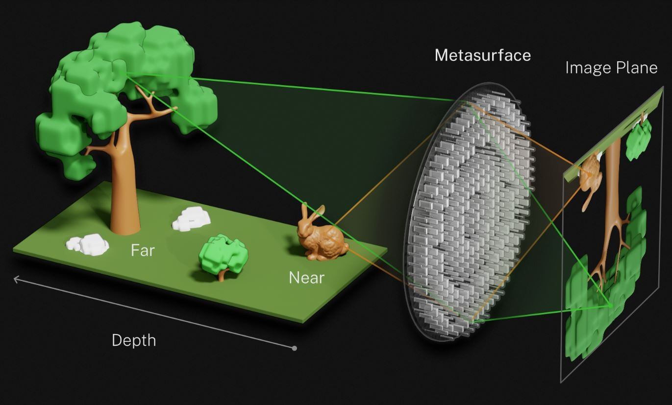 Los investigadores fabricaron una serie de lentes diminutas conocidas como metalenses. Estas son películas ultrafinas grabadas o impresas con grupos de pilares a nanoescala diseñados para manipular la luz de formas específicas. Para diseñar sus metalenses, Agrawal y sus colegas tachonaron una superficie plana de vidrio con millones de diminutos pilares rectangulares de escala nanométrica. La forma y la orientación de los nanopilares constituyentes enfocaban la luz de tal manera que la metasuperficie actuaba simultáneamente como una lente macro (para objetos cercanos) y una lente telefoto (para objetos distantes).