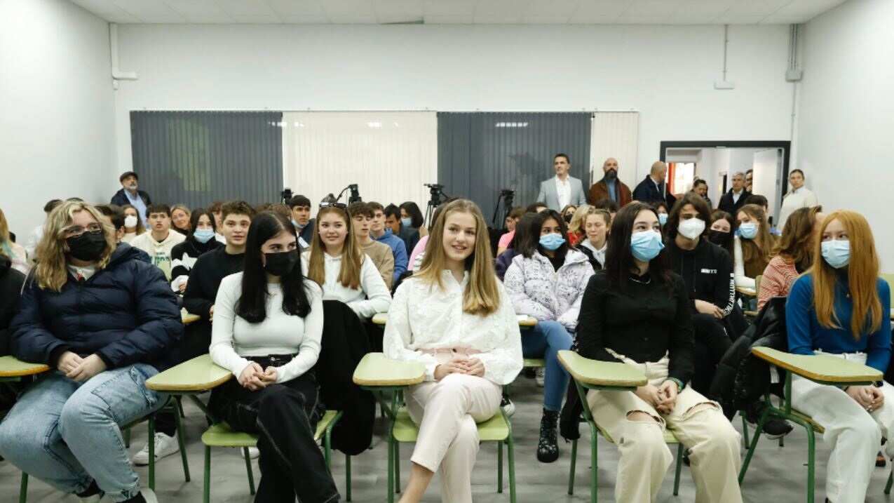 La heredera al trono, sin mascarilla y vestida como buena parte de las estudiantes, ha participado en la ‘Jornada sobre Juventud y Ciberseguridad: Disfruta de Internet con Seguridad’ organizada por el Instituto Nacional de Ciberseguridad (INCIBE) junto a 39 alumnos de este centro y ha intervenido en uno de los cuatro grupos de trabajo que se han organizado durante la misma.