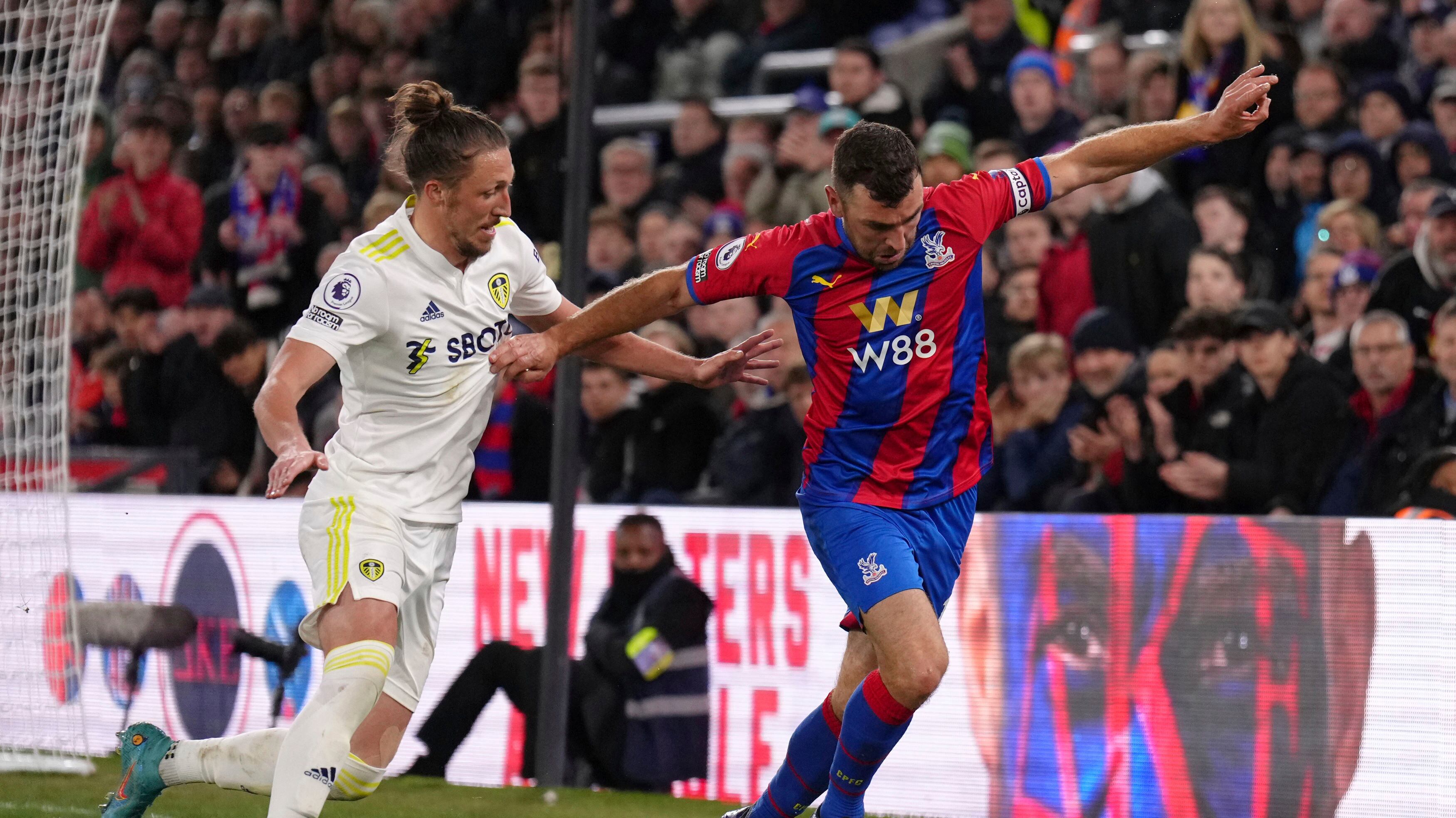 Luke Ayling (izquierda) del Leeds United y James McArthur de Crystal Palace pugnan por un balón en el partido de la Liga Premier, el lunes 25 de abril de 2022. (John Walton/PA vía AP) (John Walton/AP)