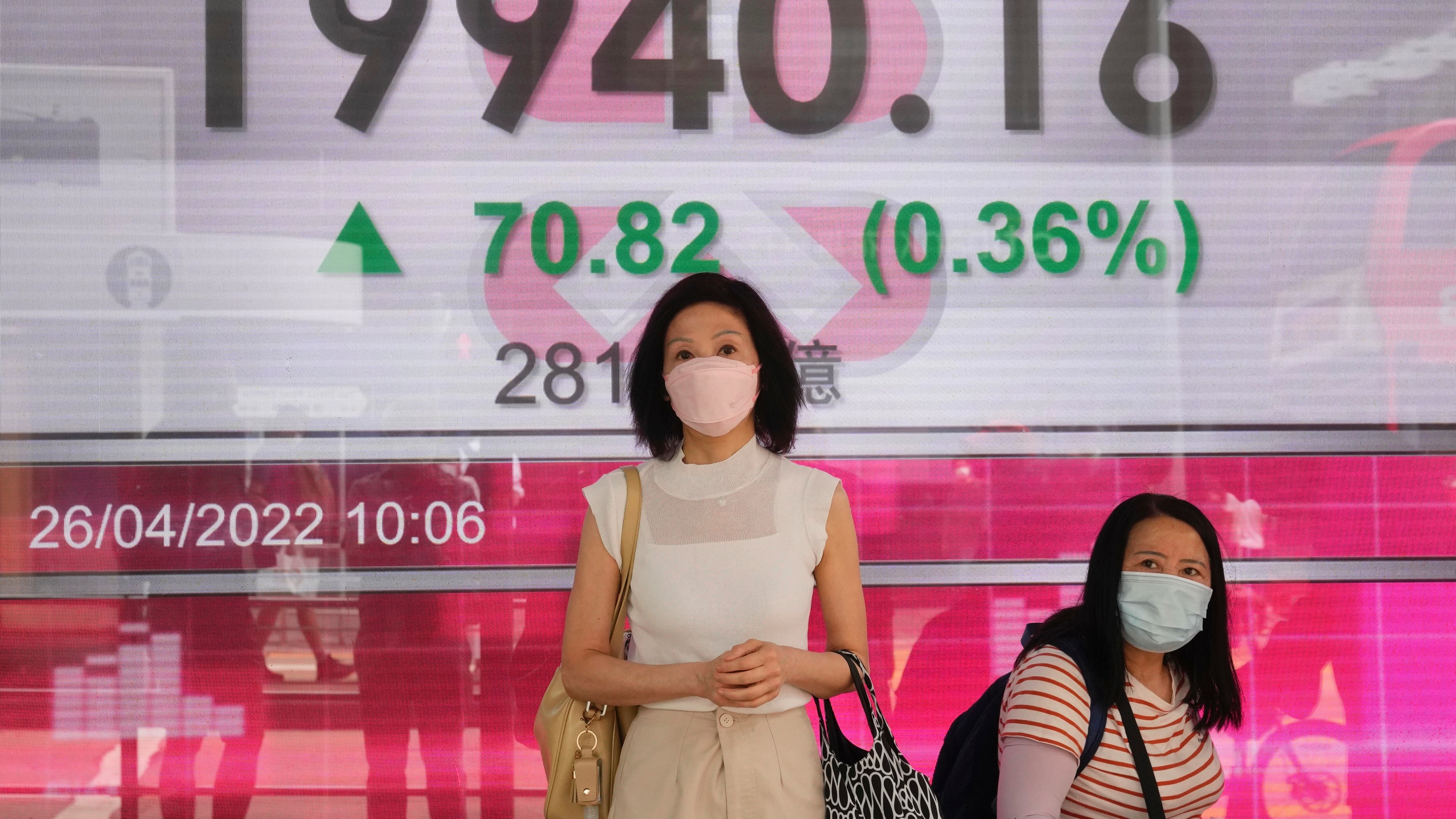 Personas frente a una cartelera financiera en Hong Kong, el 26 de abril del 2022. (Foto AP/Kin Cheung) (Kin Cheung/AP)