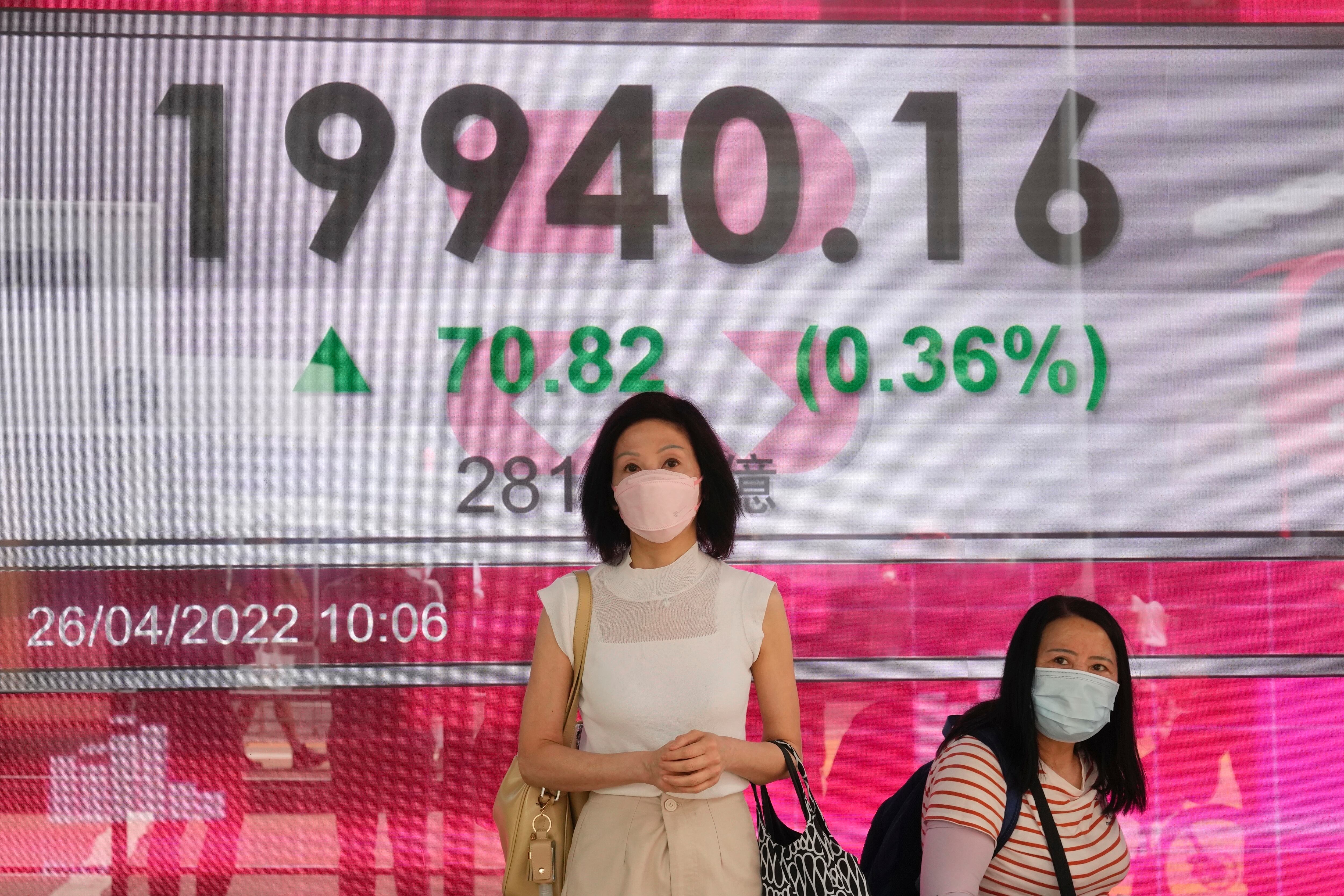 Personas frente a una cartelera financiera en Hong Kong, el 26 de abril del 2022. (Foto AP/Kin Cheung) (Kin Cheung/AP)