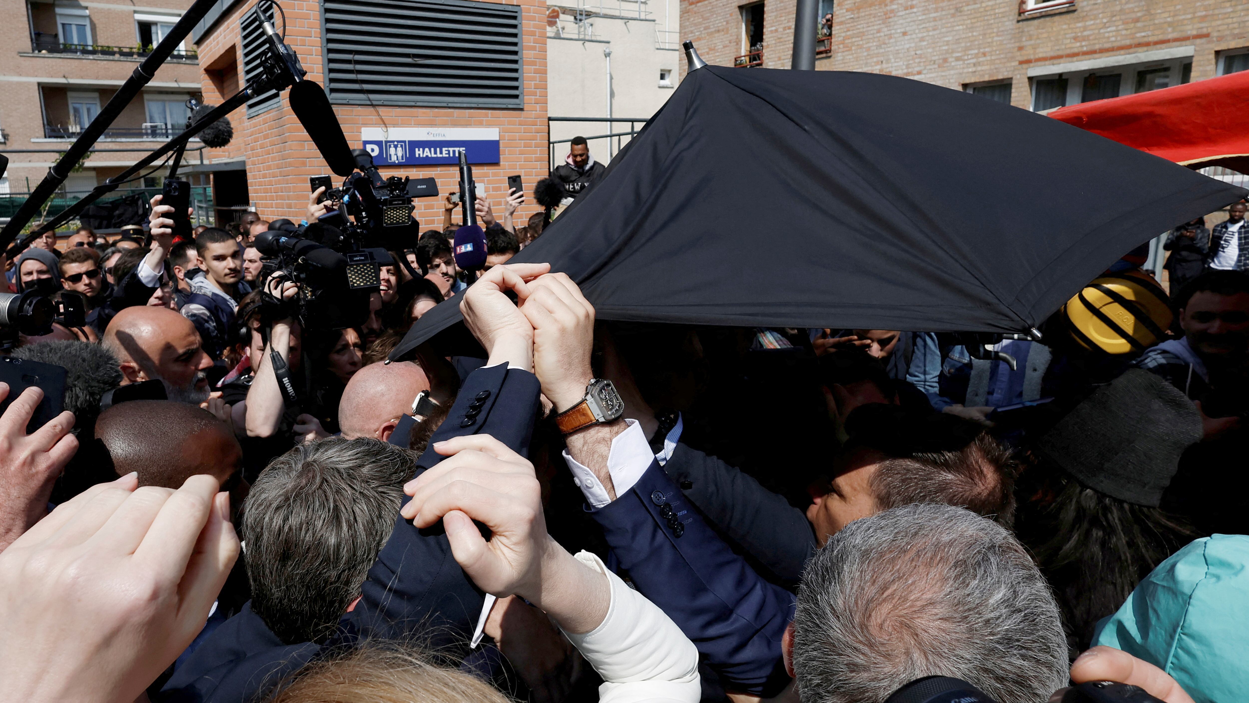 Una persona abrió un paraguas para escudar al mandatario y los guardaespaldas lo llevaron rápidamente a uno de los puestos del mercado. Macron estuvo allí unos minutos hasta que se calmó la situación.