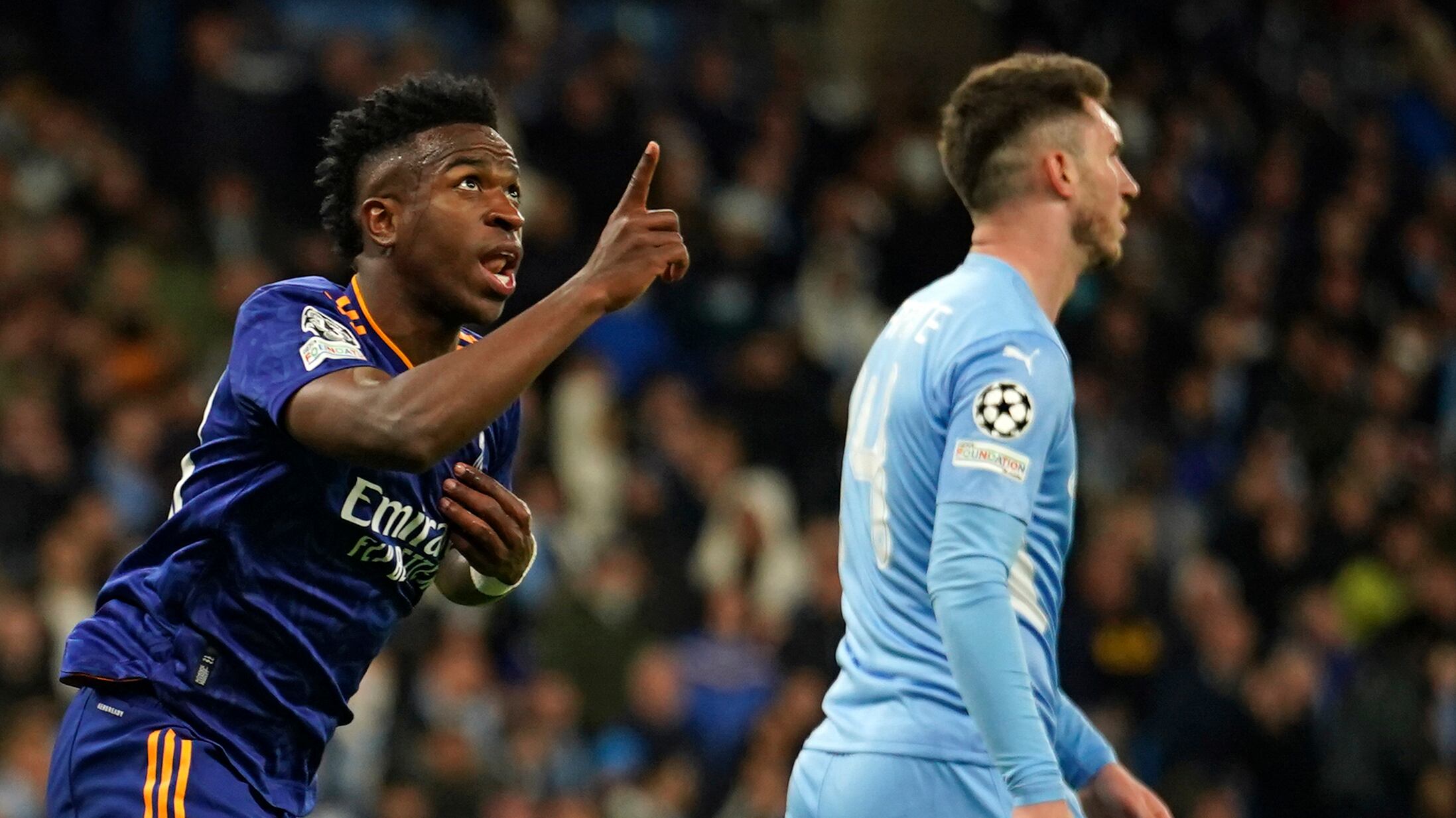 Vinicius Junior (izquierda) celebra tras marcar el segundo gol del Real Madrid en la derrota 4-3 ante el Manchester City en la ida de las semifinales de la Liga de Campeones, el 26 de abril de 2022. (AP Foto/Dave Thompson) (Dave Thompson/AP)