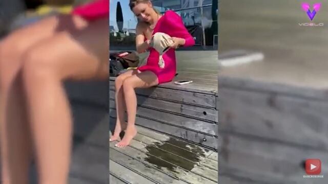 Cuando Karina lanzó su bolso al aire antes de que pudiera intentar cogerlo, el viento hizo que el bolso se le escapara de las manos. El bolso terminó en el agua debajo de los muelles, pero afortunadamente un chico que caminaba cerca y vio el incidente fue capaz de bajar y rescatar el bolso empapado.