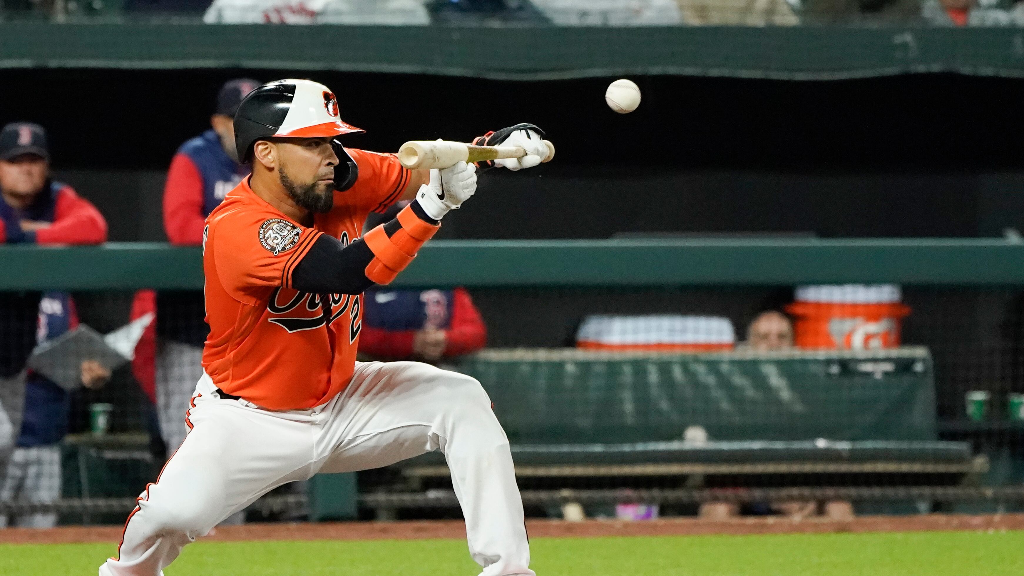 El venezolano Robinson Chirinos, de los Orioles de Baltimore, realiza un toque de bola en la décima entrada del juego ante los Medias Rojas de Boston, el sábado 30 de abril de 2022 (AP Foto/Julio Cortez) (Julio Cortez/AP)