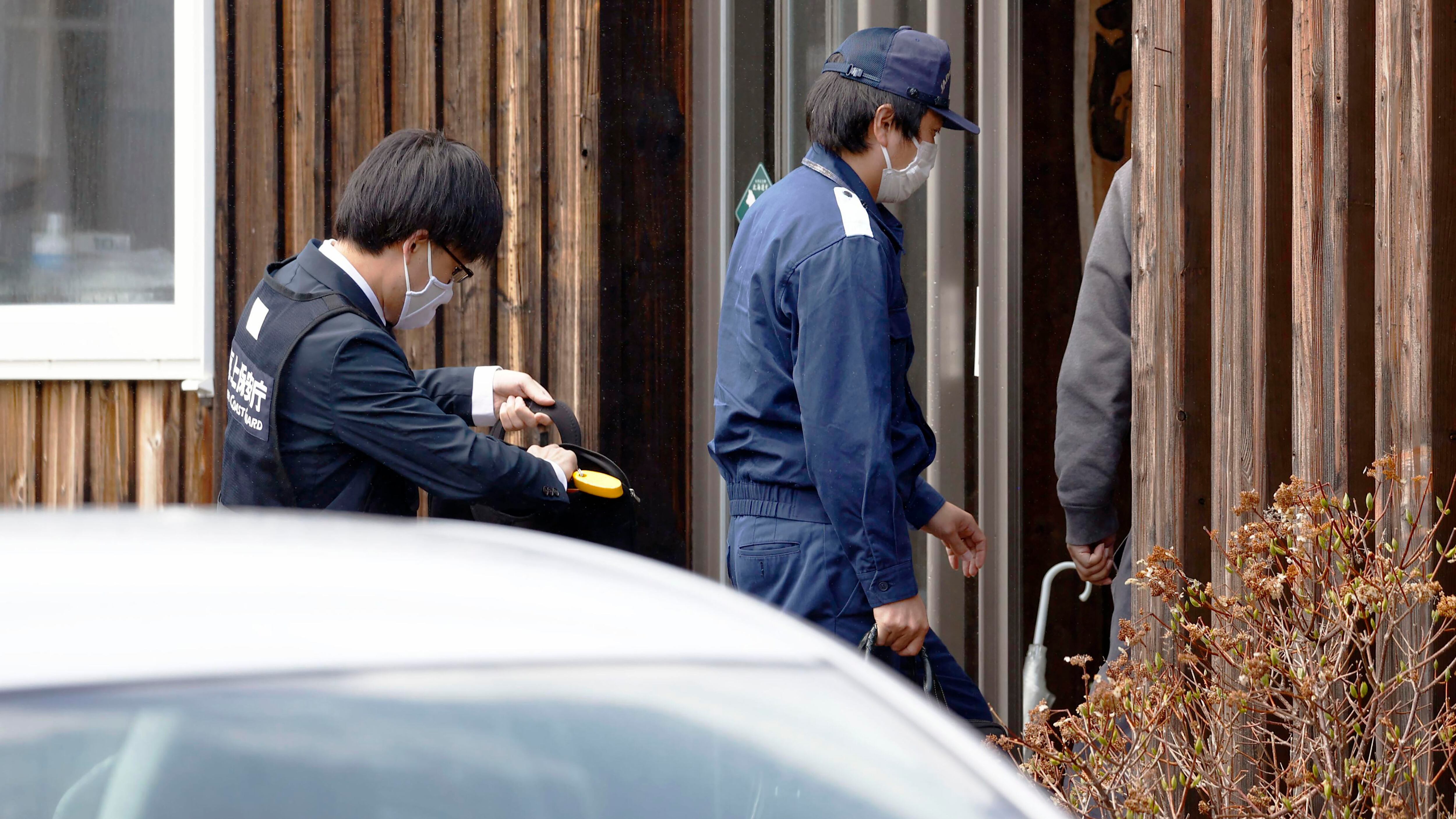 Agentes de la guardia costera entran a la oficina de una empresa que operaba un barco naufragado en Shari, en la isla norteña de Hokkaido, Japón, el 2 de mayo de 2022. (Kyodo News vía AP) (深井洋平/AP)