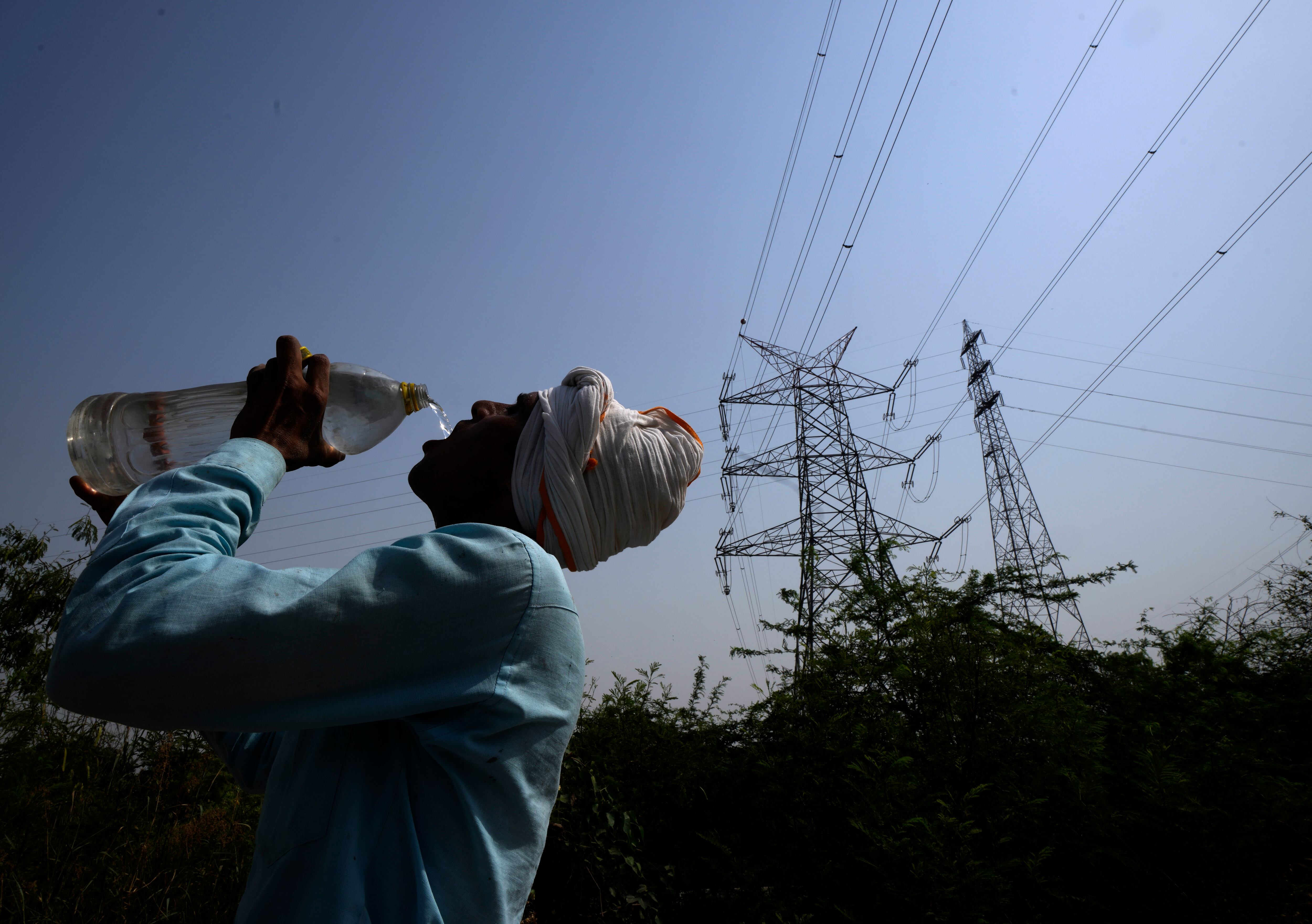 Un trabajador bebe agua junto a un tendido eléctrico durante una ola de calor en la capital de India, Nueva Delhi, el lunes 2 de mayo de 2022. (AP Foto/Manish Swarup) (Manish Swarup/AP)