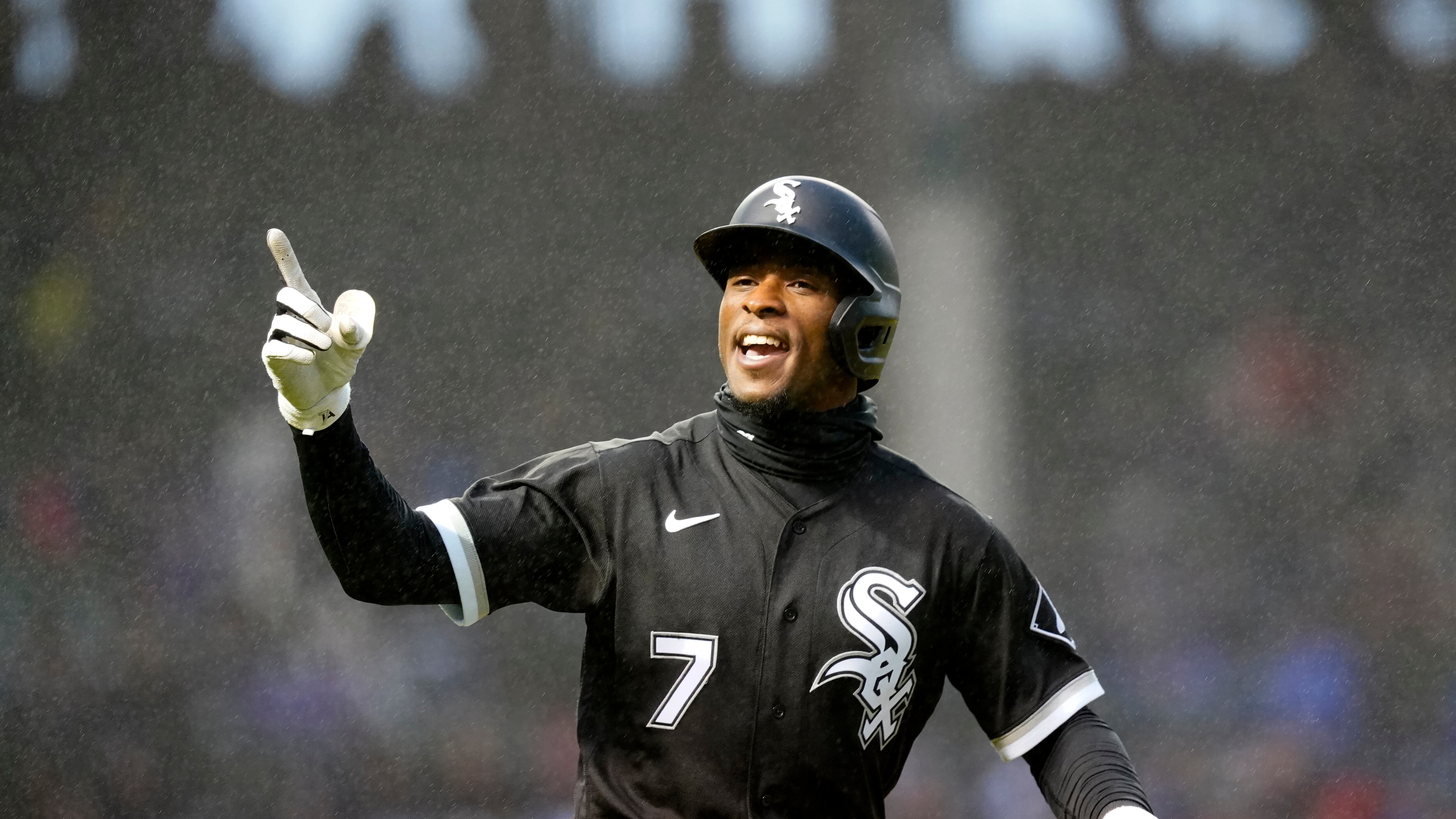 Bajo la lluvia, Tim Anderson, de los Medias Blancas de Chicago, festeja su jonrón ante los Cachorros de la misma ciudad, el martes 3 de mayo de 2022 (AP Foto/Charles Rex Arbogast) (Charles Rex Arbogast/AP)
